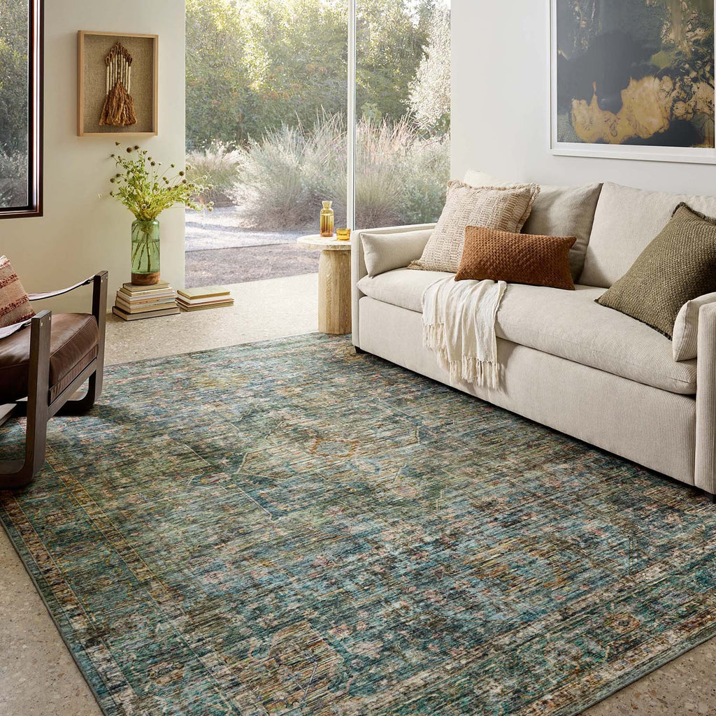 The Loloi Anniston Collection is a washable rug with traditional motifs in beautifully saturated and distressed tones. This durable area rug is power-loomed of polyester in China and designed for the busiest rooms of the home—living rooms, bedrooms, kitchens, hallways, and more. It can be washed in a home washing machine without an agitator, depending on the size. Wash in cold water, delicate cycle, with mild detergent, and no bleach; hang dry or lay flat to dry.