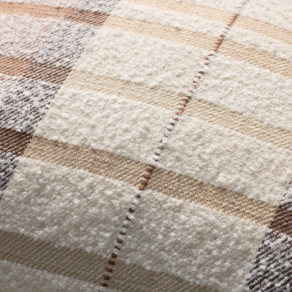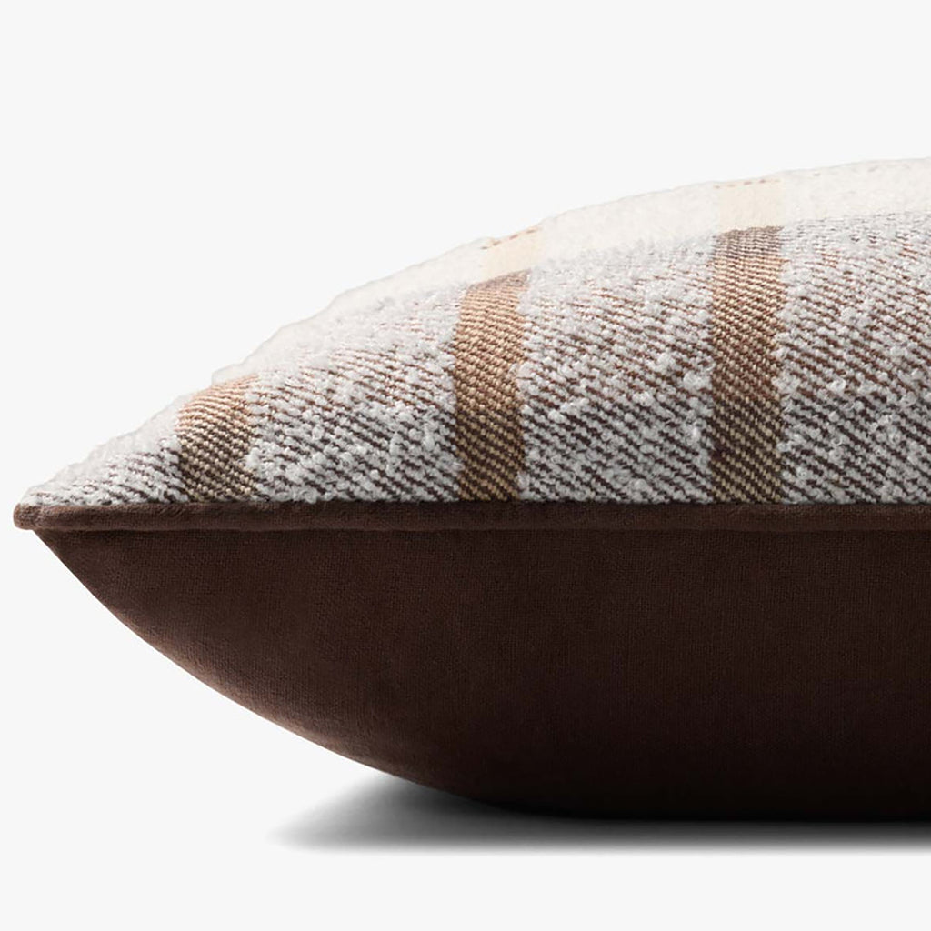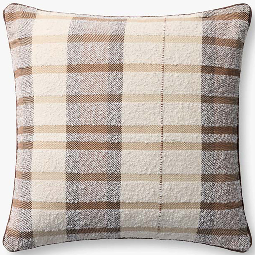 This tonal brown and beige plaid throw pillow with brown piping adds a classic coziness to a wide range of home decor styles, from farmhouse to coastal. The 20” x 20” square pillow is machine-woven in India of cotton and polyester.