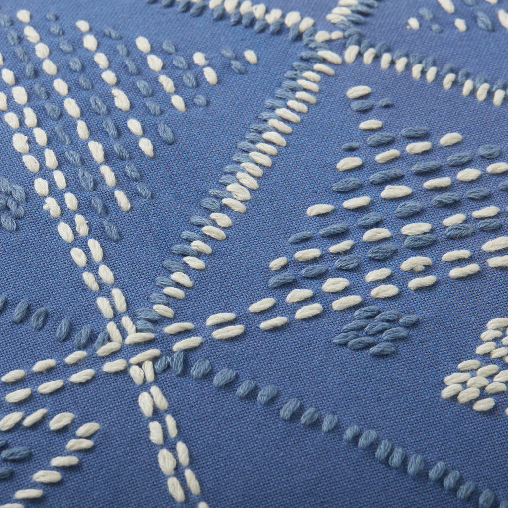 This striking blue and white stitched pillow offers an effortless bohemian vibe. The folk art inspired embroidery stitches are refreshingly simple and add cozy understated charm to a space. Crafted in India of 100% cotton.