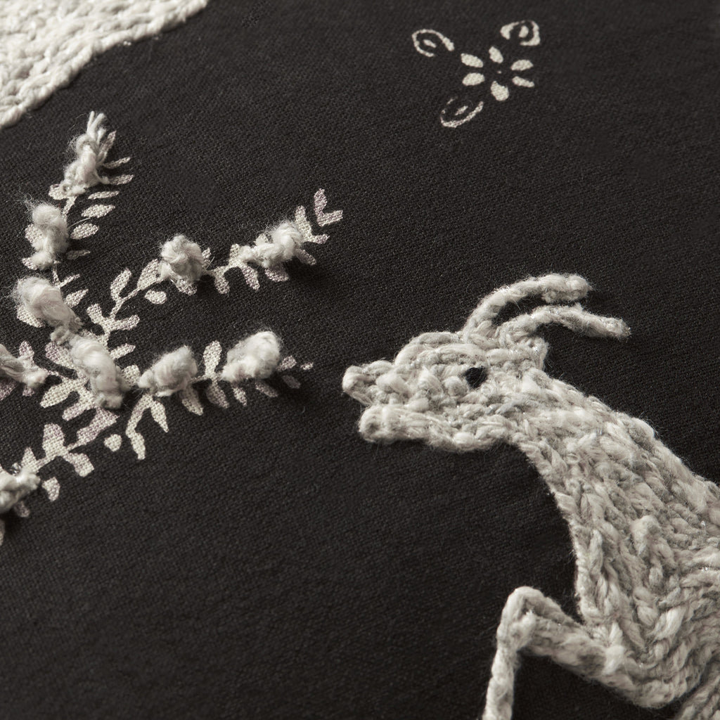 Light, delicate embroidery is especially fresh in a classic combination of ivory and black. We love the tassels in contrasting black cotton. Created in India.