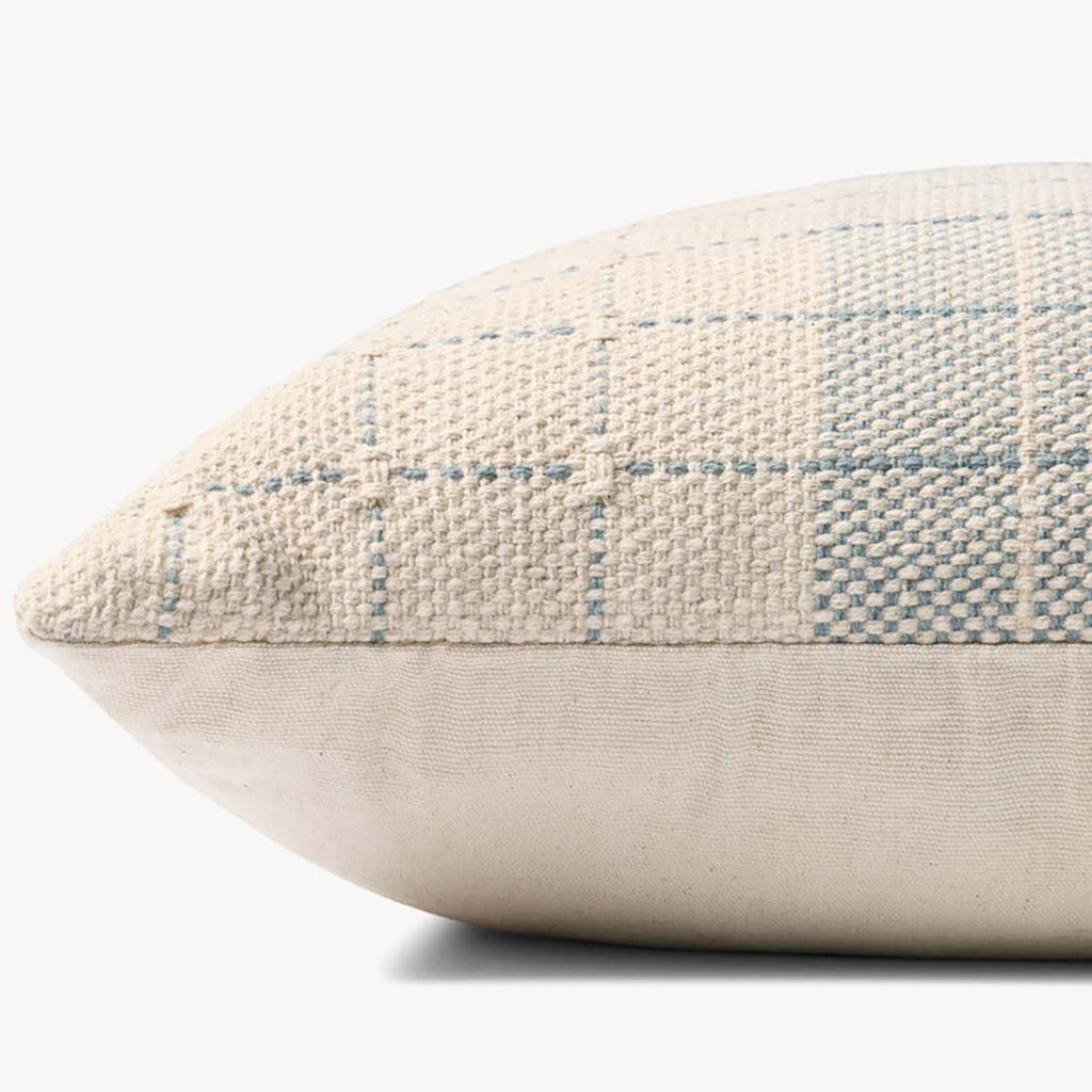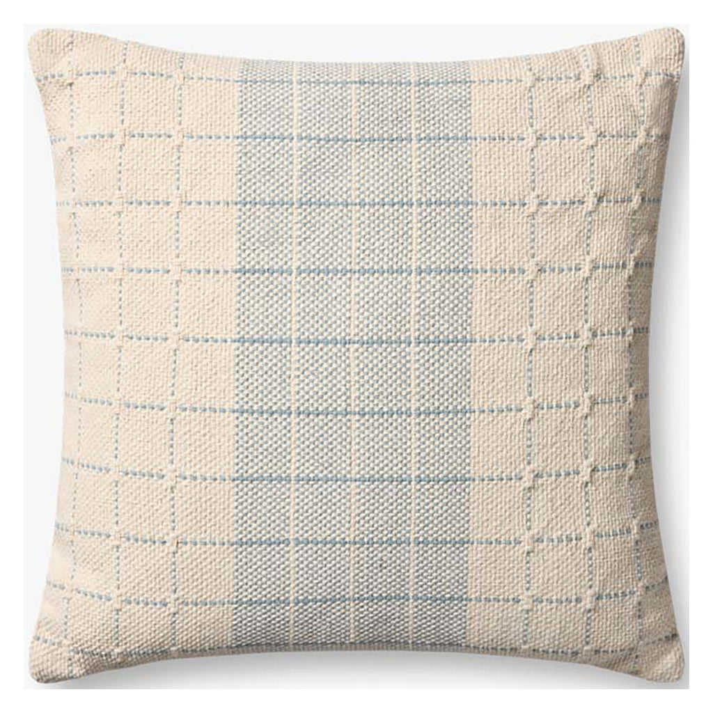 This sophisticated throw pillow features a grid design in beige and natural ivory, adding timeless pattern to living rooms, bedrooms, and more. The 22in x 22in pillow is hand-woven in India of 100% cotton.