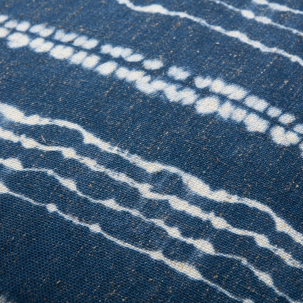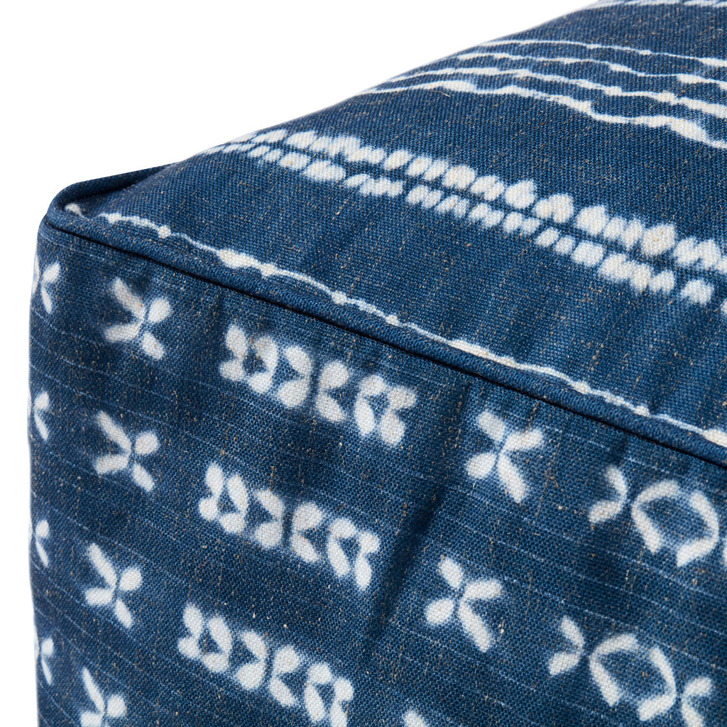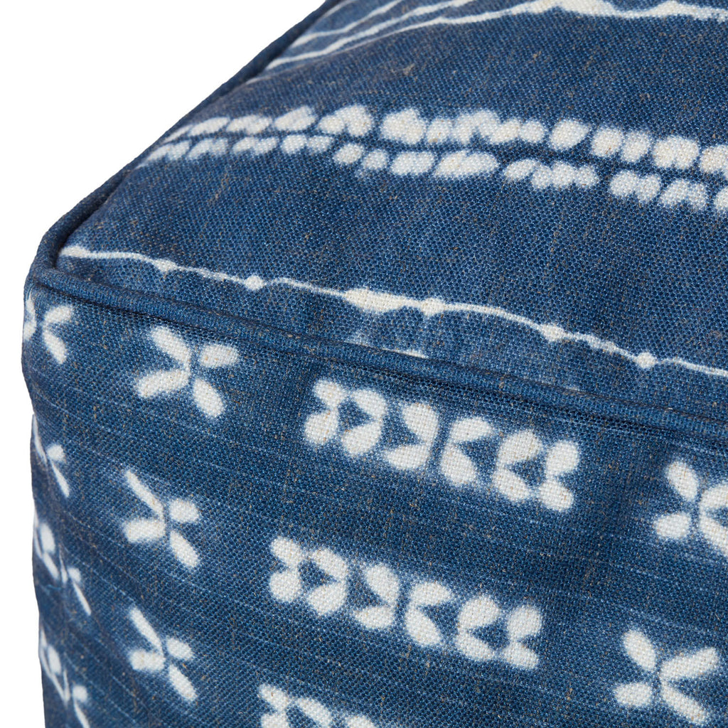 This large floor pouf with a traditional indigo design can be used as an accent piece or extra seating in your living room. The pouf measures 20"W x 20"D x 12"H and is machine-woven of polyester and linen.