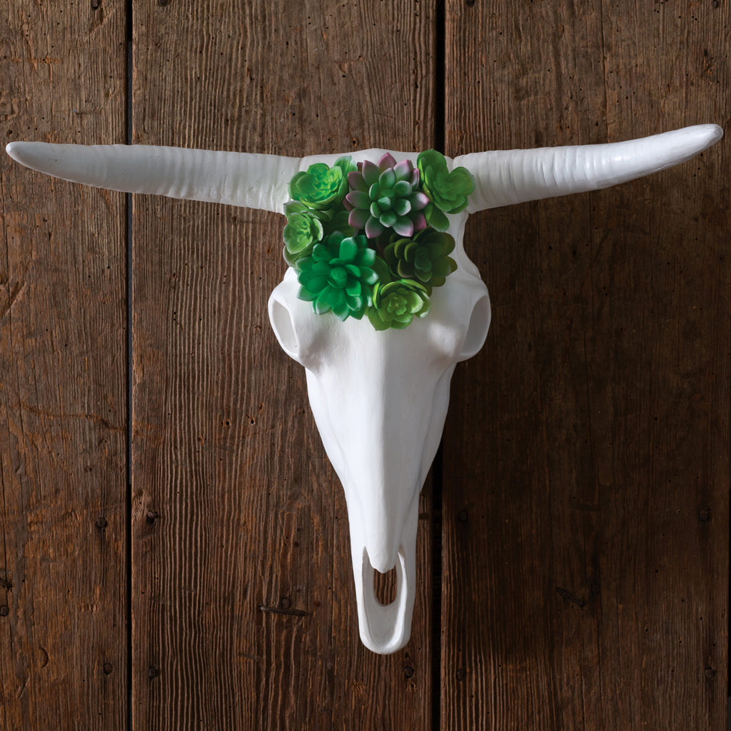 Bring your love for boho and western decor together with this longhorn skull. Item features artificial succulents on a painted, white faux longhorn skull. To hang, use its keyhole hanger.