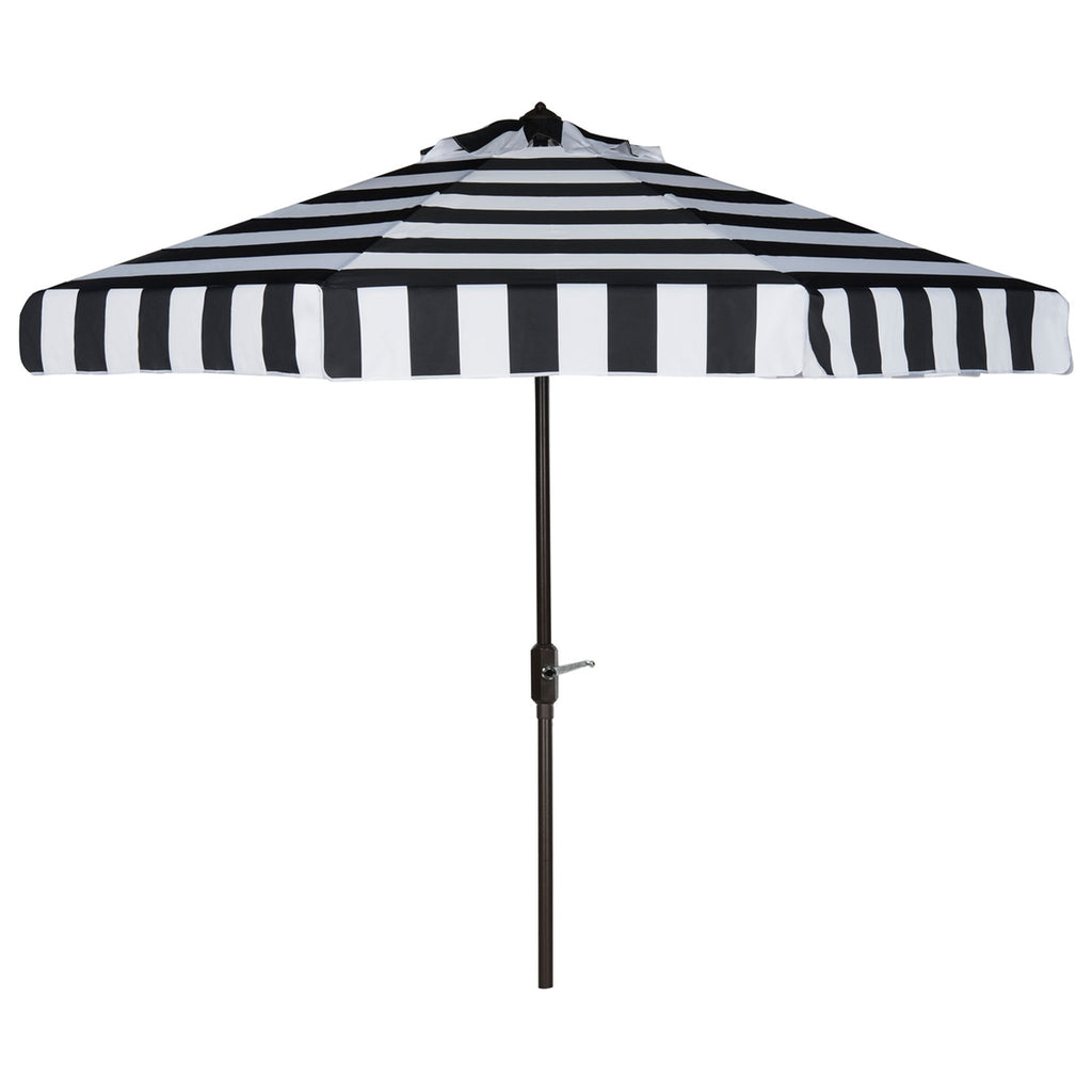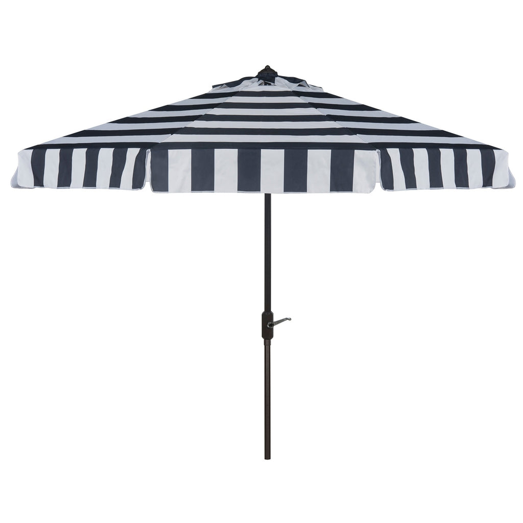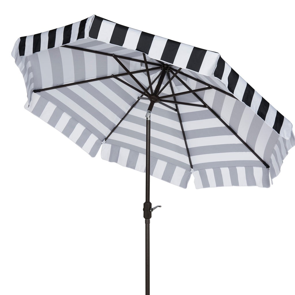A favorite respite for jetsetters, the healing waters of an infamous health spa in Germany’s village of Baden Baden inspired this fashionable outdoor umbrella. Bright navy or black and white stripes keep it classic while its elegant trim makes a coy gesture.