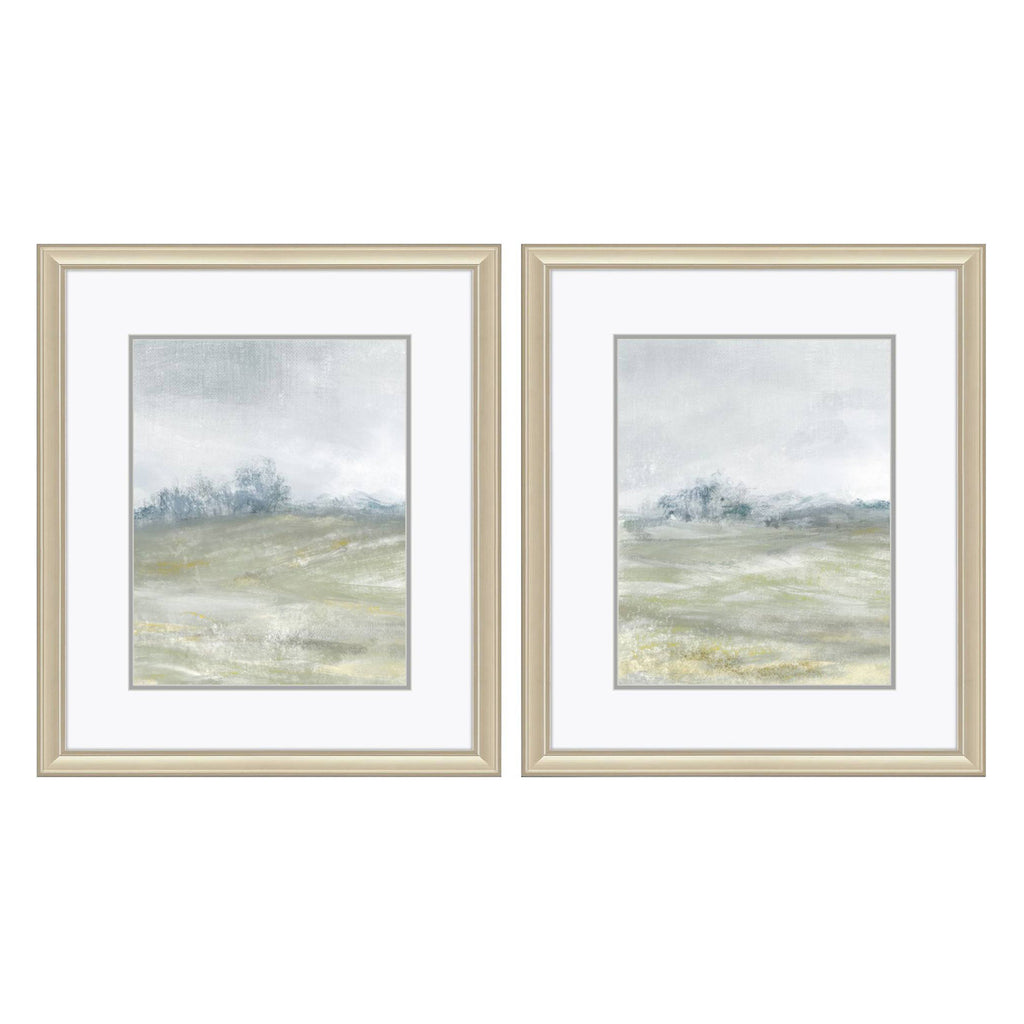 A set of two muted landscape images accentuated with double matting. These pieces are framed under glass and paired with an antique silver frame.