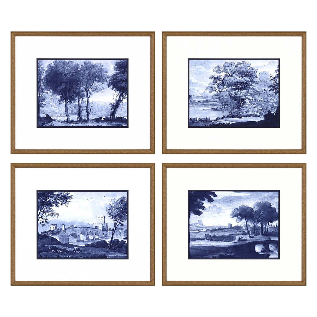 Vintage landscapes in blue are matted in white. Framed in an antique gold wood with embossed weave pattern. Sold as set of four.