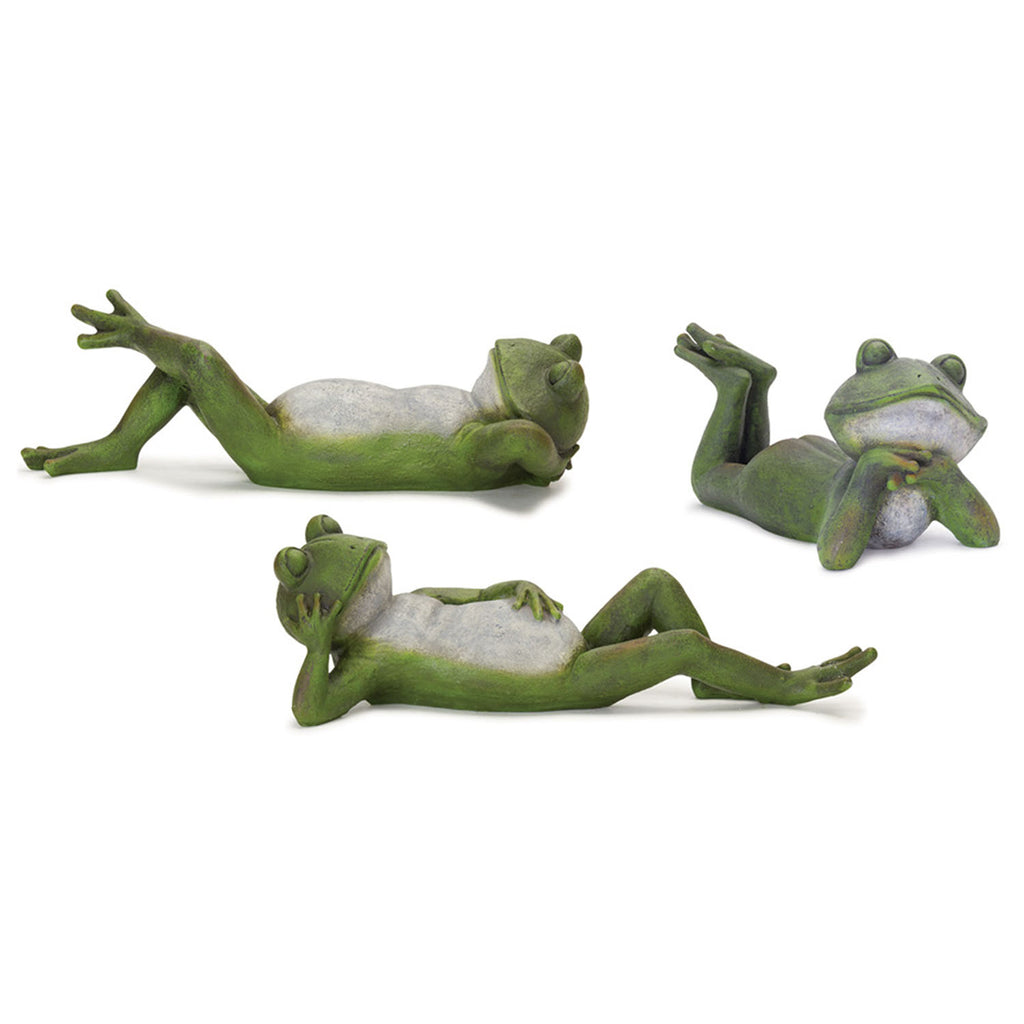 Get your home ready for spring with this adorable set of Lounging Frog Figurines. Featuring three assorted designs, the quality polyresin and lime powder composition paired with the weathered-paint finish is the perfect combination to create a stunning spring display. This set is recommended for both indoor and outdoor covered use. Display in your home to add a touch of whimsical fun, or display in your garden to give it character.