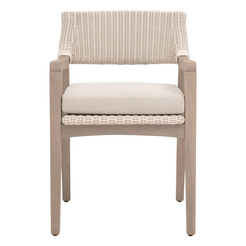 The wicker design of the Lucia Outdoor Arm Chair by Essentials For Living brings a coastal look to the outdoors. It measures 21.75" wide, 22" deep, and 31" high, with a seat height of 21". This outdoor dining chair is constructed with solid teak legs, making it not only sturdy, but durable. White synthetic wicker is tightly woven to create a gorgeous wicker design, while the teak legs and arms have a beautiful washed ever finish that is resilient to changes from the elements. It is paired with a removable performance stone all-weather olefin seat cushion. The chair and cushion should be stored away in extreme weather conditions. The chair provides comfort with style and will be the perfect addition to any backyard or patio.