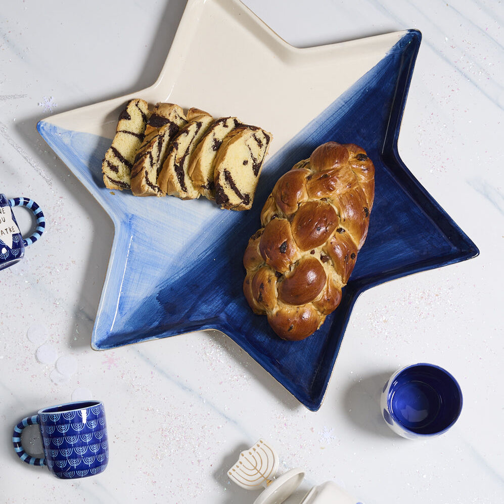 Bring the star of wonder and light to the table with the Magen Platter, perfect for Hanukkah celebrations & holiday gatherings. This Star of David shaped tray features a blue & white glossy handpainted interior & a textured natural clay exterior. This food-safe piece is ideal for serving treats & comes in 2 sizes for a coordinated tablescape.