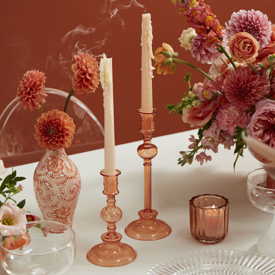 Create a trendsetting centerpiece with the slim, Maren Candleholder. Made from very lightweight, handmade borosilicate glass in a warm amber tone, this candlestick with its classic shape & trendy color is chic, unique, & versatile for pairing with any style of home decor or wedding & event design. Add a standard size taper candle & layer with other amber tabletop pieces. It also fits nicely under a 4-inch glass sleeve.