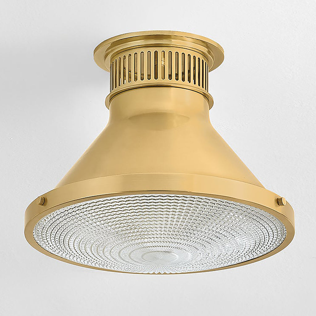 The Highclere family blends industrial and classic elements to create a modern, elevated basic. Etched for added texture, the clear optic glass shade creates a beautiful diffusion of light while the bell-shaped silhouette of the shade is accented by Mark D. Sikes' signature brass screw detailing. Highclere is available as a small and large flush mount and a small and large pendant. The three finish options include Aged Brass, Aged Brass and Off-White, and Aged Brass and Soft French Blue.