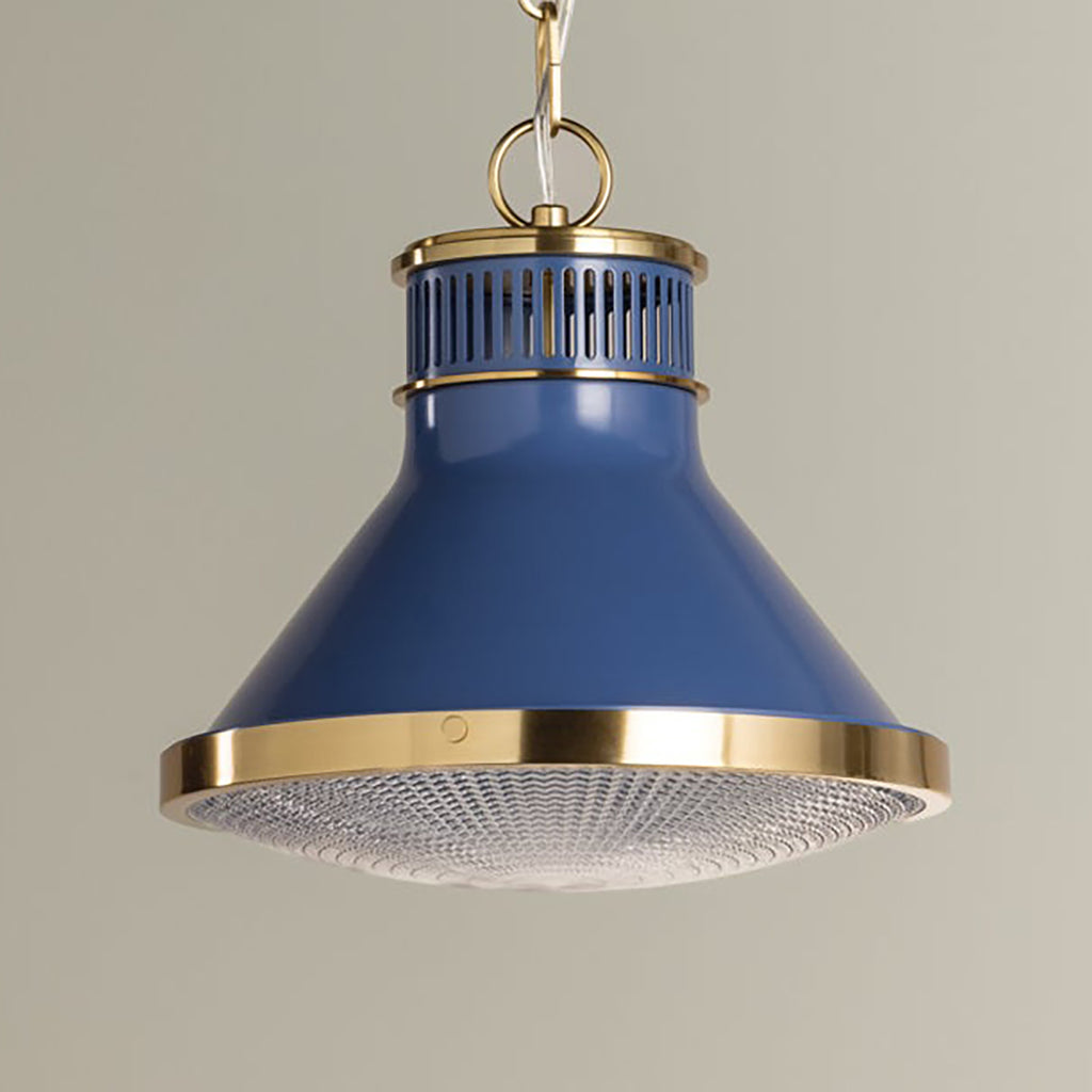 The Highclere family blends industrial and classic elements to create a modern, elevated basic. Etched for added texture, the clear optic glass shade creates a beautiful diffusion of light while the bell-shaped silhouette of the shade is accented by Mark D. Sikes' signature brass screw detailing. Highclere is available as a small and large flush mount and a small and large pendant. The three finish options include Aged Brass, Aged Brass and Off-White, and Aged Brass and Soft French Blue.