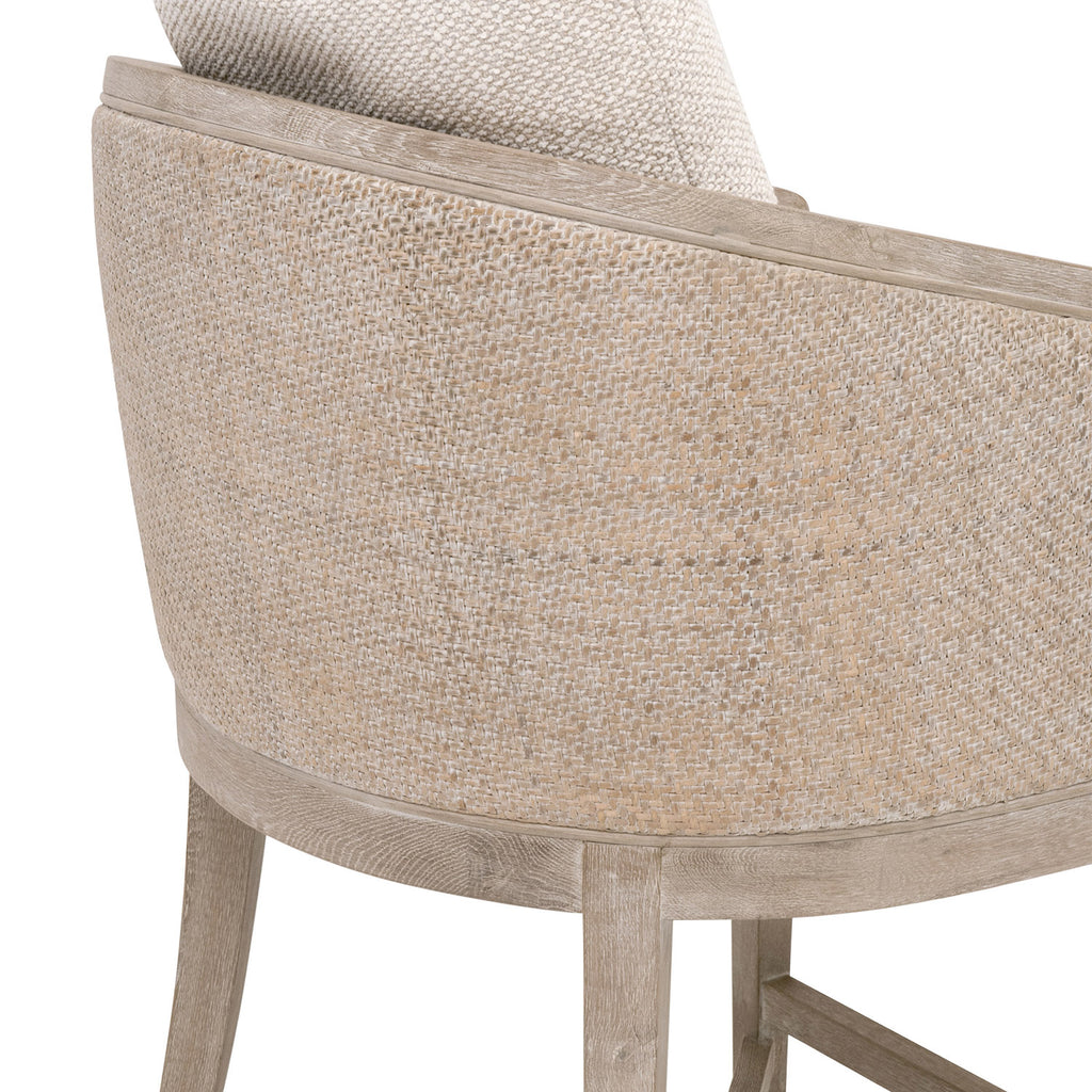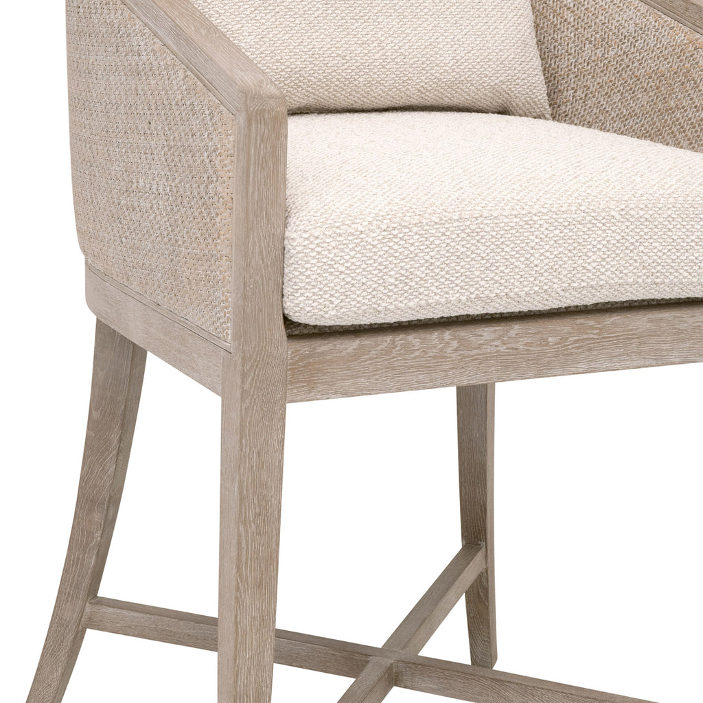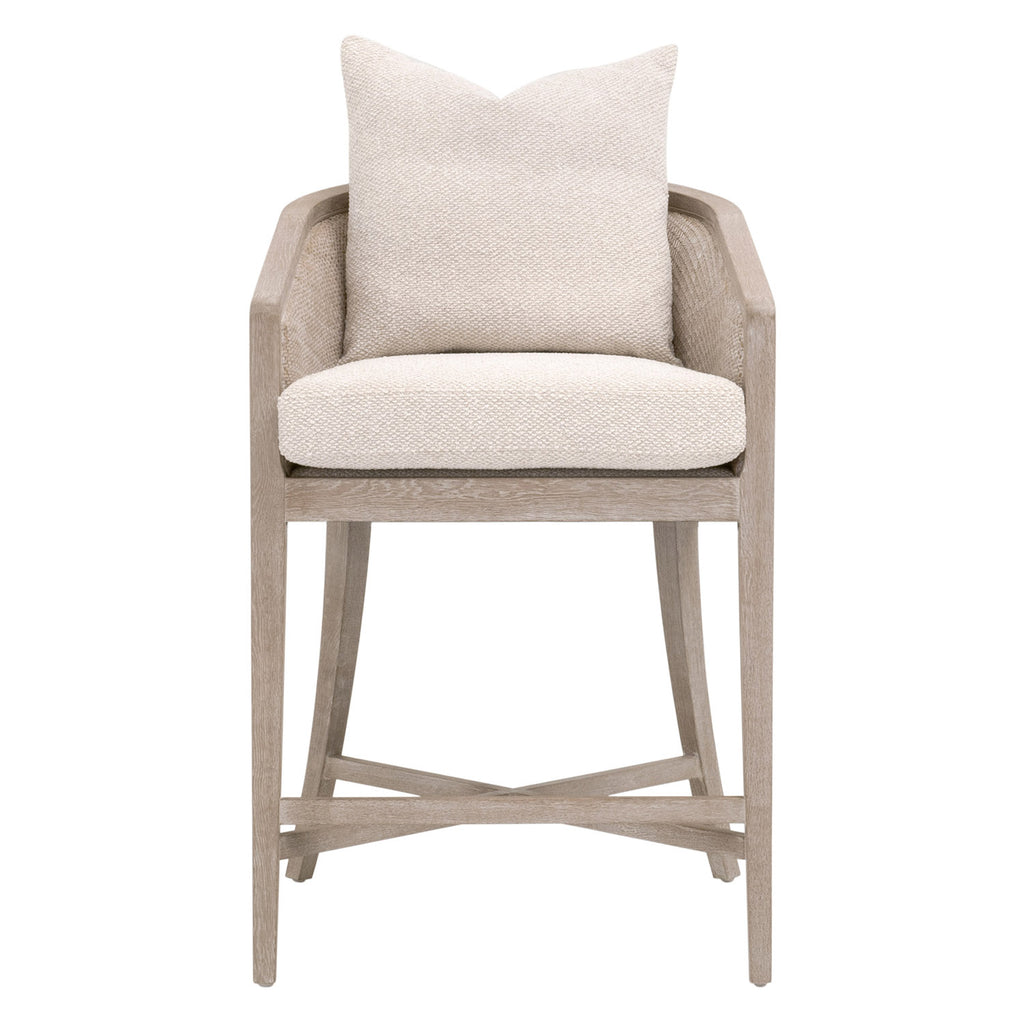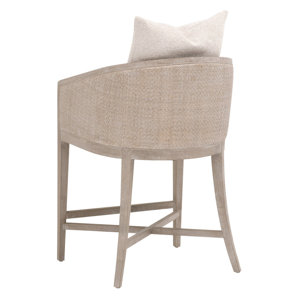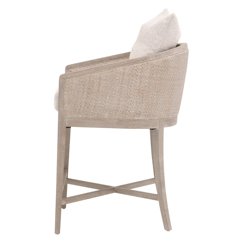 Experience comfort in style with the McGuire Counter Stool by Essentials For Living. This transitional masterpiece measures 22.5in wide, 26in deep, and 35.75in high, with a 28.5in seat height. Meticulously crafted, it features a solid oak wood frame enveloped in natural gray rattan, exuding sophistication with organic and earthy elements. Its LiveSmart Gellar-Linen upholstery ensures resilience and easy upkeep, while the intricately cane-wrapped surround detail adds artisanal flair. Nestle into the removable and reversible seat cushion filled with a sumptuous blend of 50% polyester and 50% down feather, accompanied by a coordinating square throw pillow. With an "X" stretcher base design for both stability and visual appeal, this stool seamlessly merges high performance with superior craftsmanship, elevating any bar or counter space.