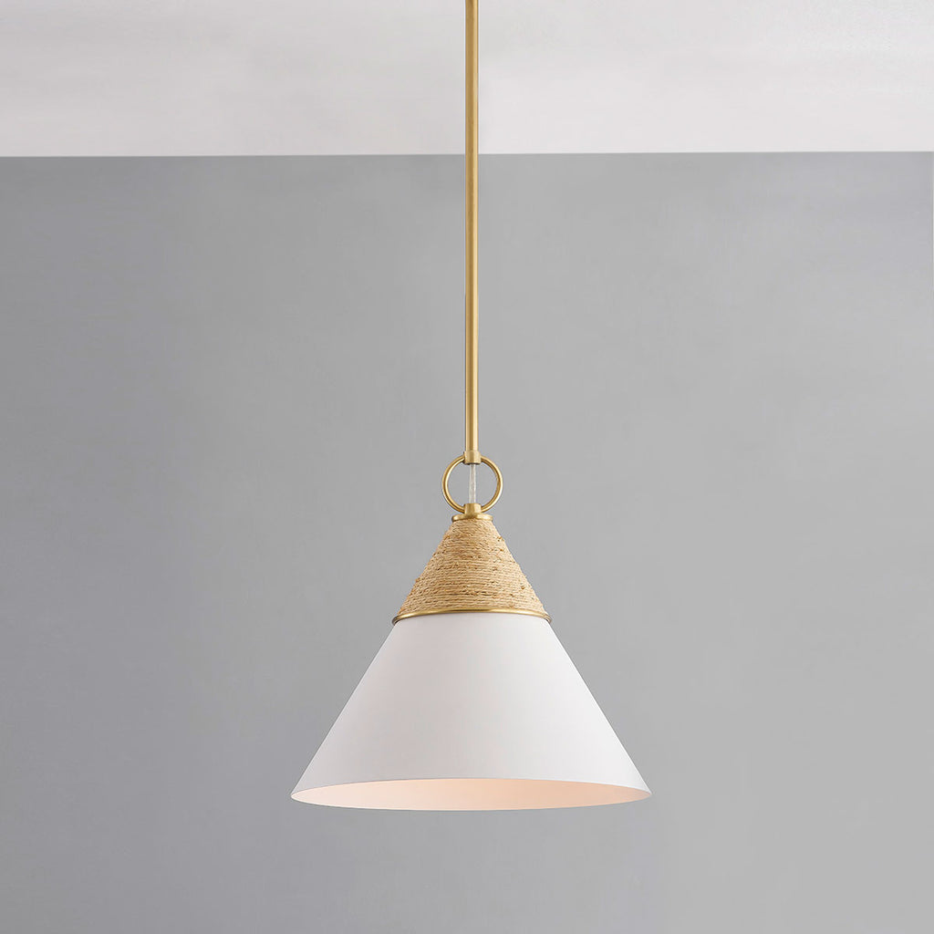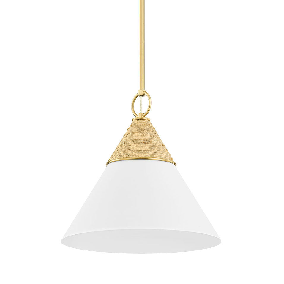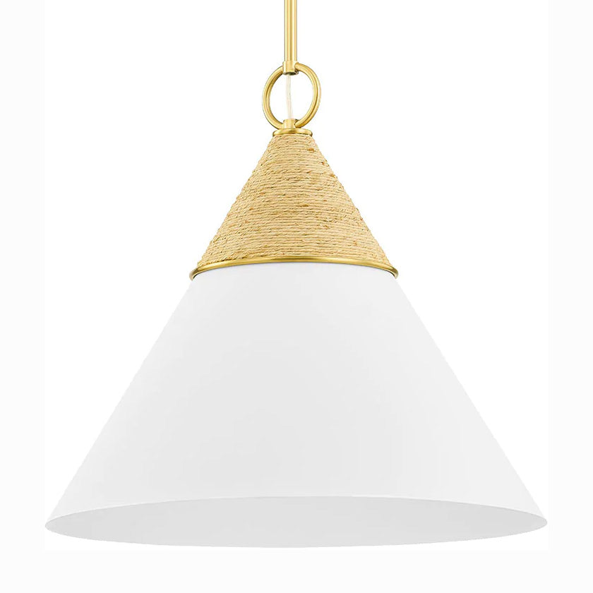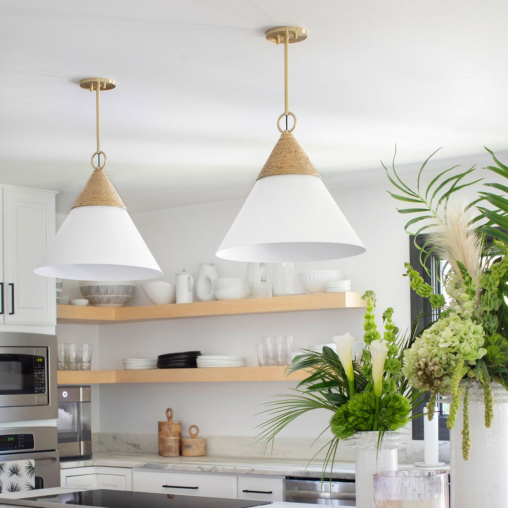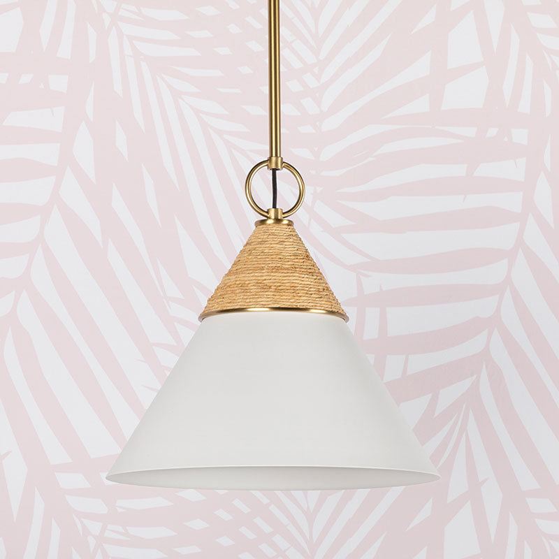 High-quality and exceedingly creative, Mitzi delivers a semi-nostalgic classic lighting collection with streamlined contemporary elements that instantly upgrade your space. A classic cone shape with coastal flair, the Mitzi Mica pendant features a raffia-wrapped, textured white shade accented by beautiful Aged Brass for a casual yet sophisticated aesthetic. Add personality to a powder room with sconces, or highlight the heart of the home with a pair of pendants over your kitchen island. Part of the Megan Molten x Mitzi Tastemakers collection.