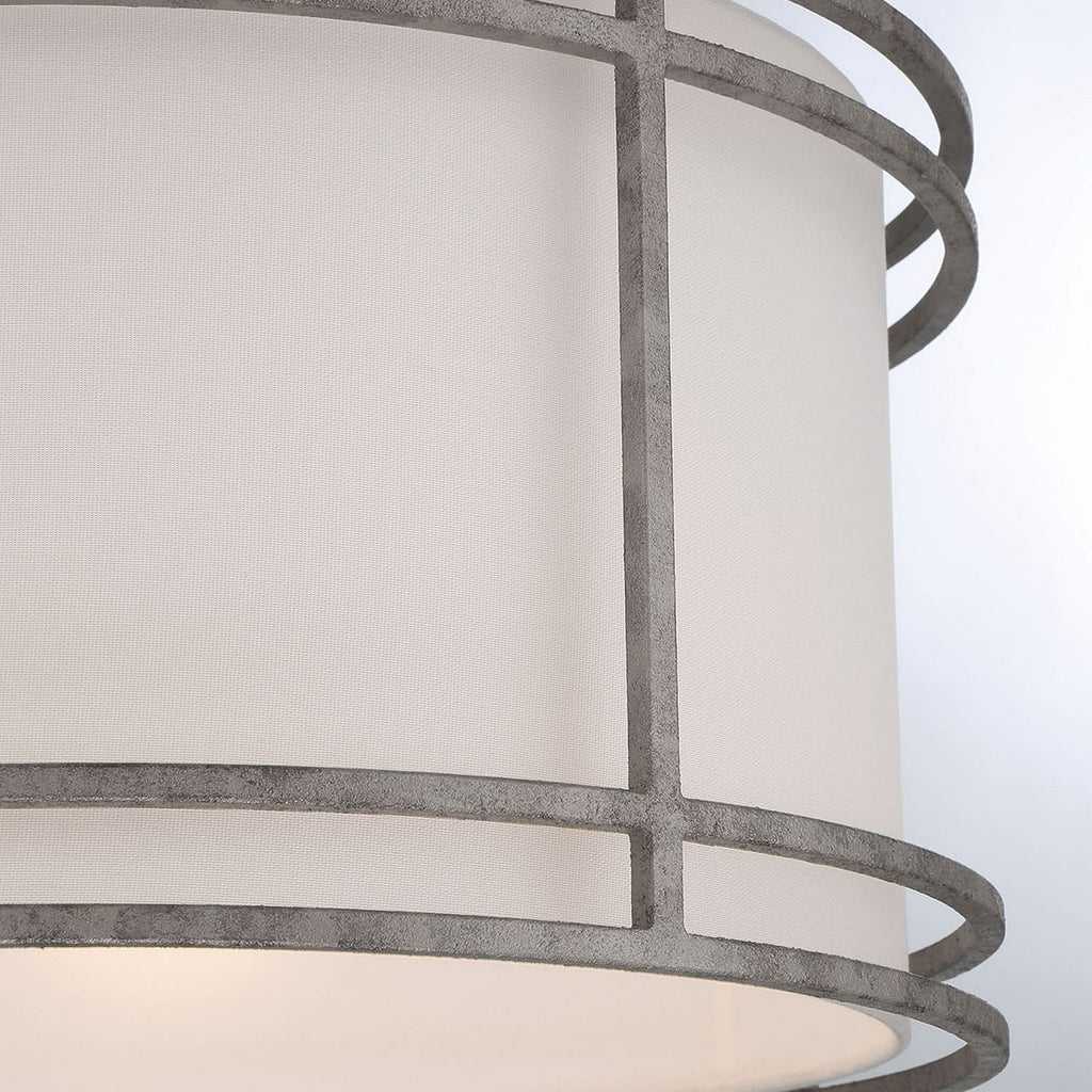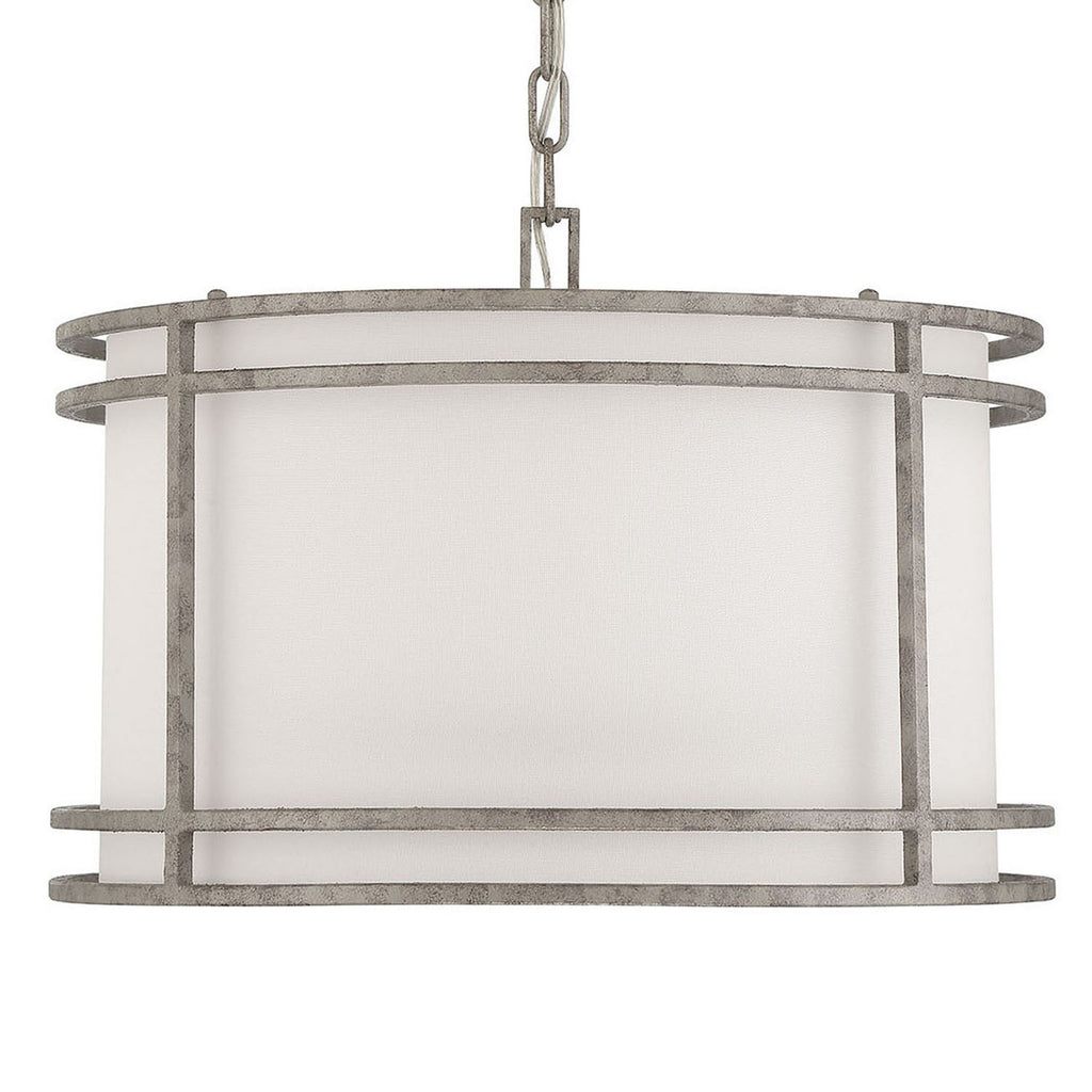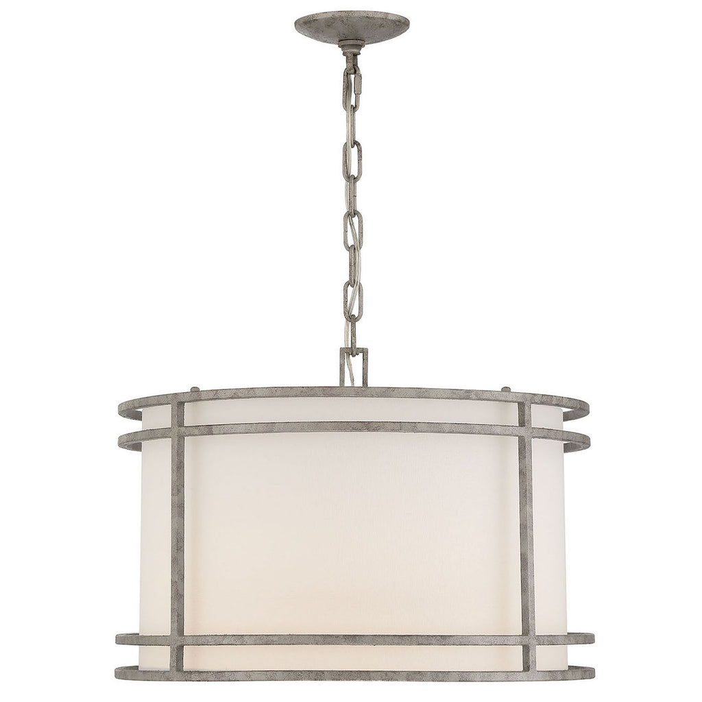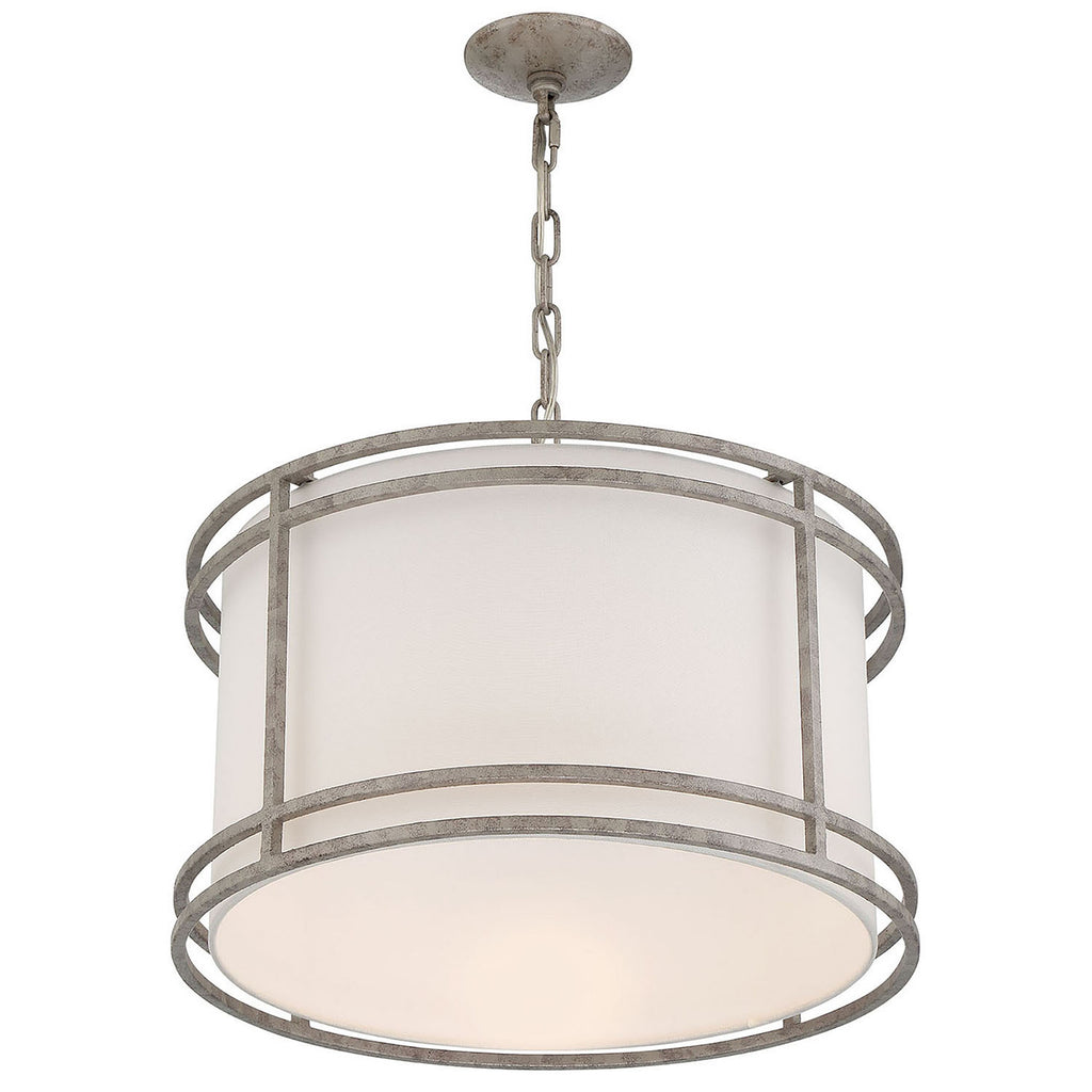 Transitional to soft contemporary in style, the Mila Statement Shaded 1-Light Drum Pendant is well-suited in a living room or kitchen space. The durable iron frame is finished with a lightly textured, hand-applied Sanded Mercury finish and completed with a crisp off-white linen hardback shade with rolled edges that diffuses the light to a warm glow. Mila measures 20 inches in diameter and 14 inches tall, large enough to make a strong ceiling statement.