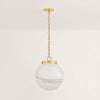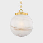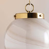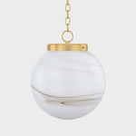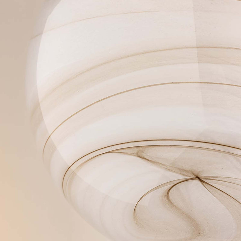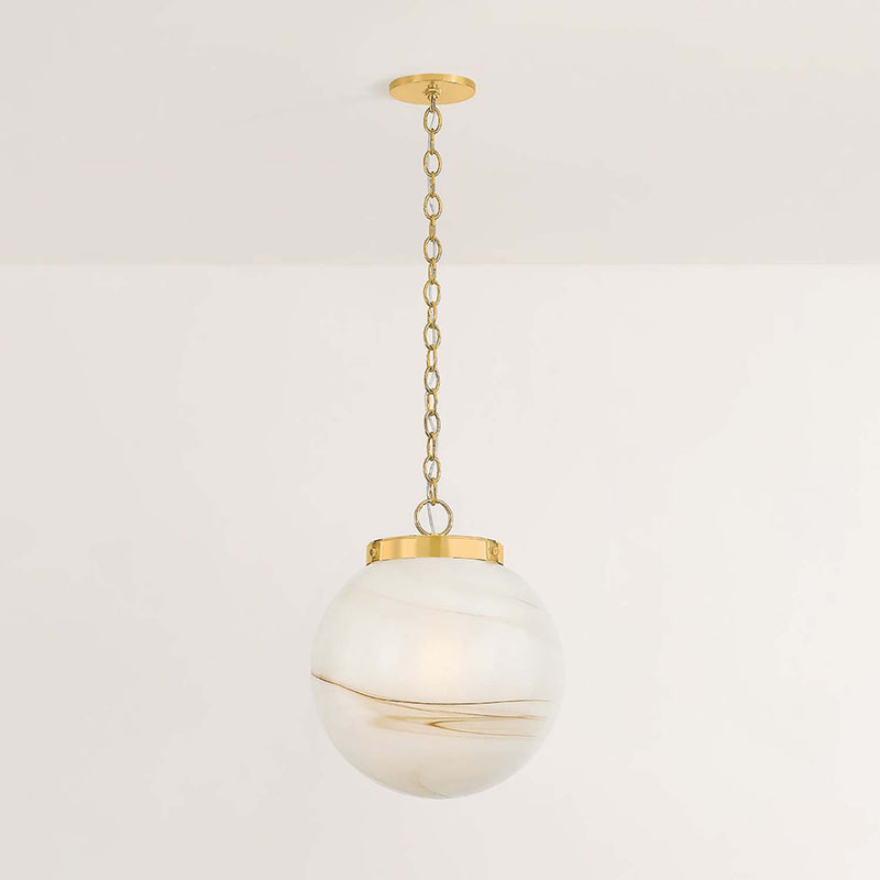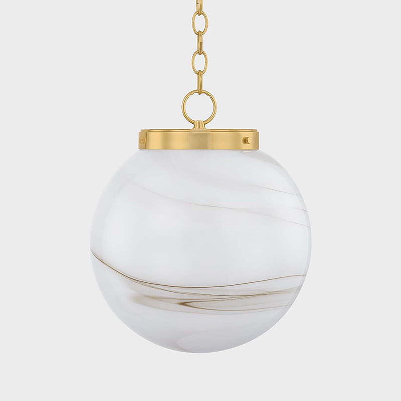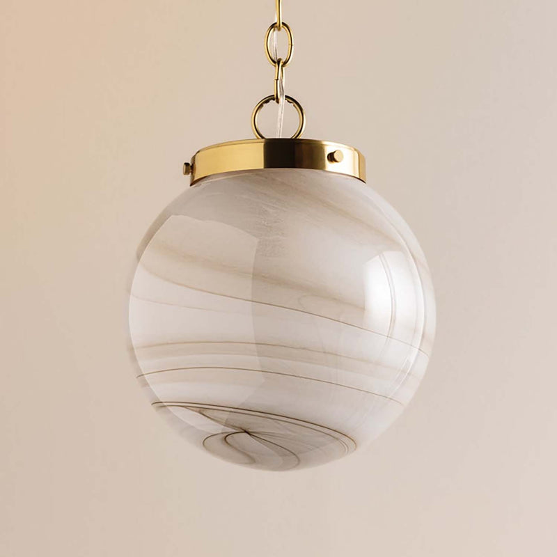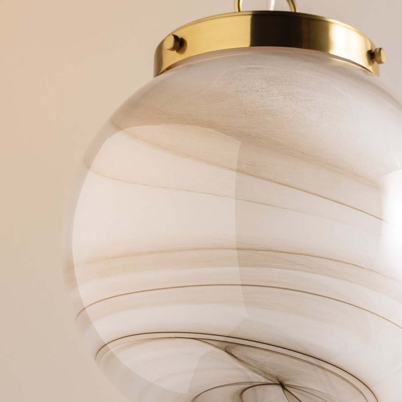 The Mitzi Ambra pendant's simplistic silhouette allows its distinctive glass technique to shine. Hand-blown in Mitzi’s factory, the Cappuccino Swirl glass showcases a stunning, marbled appearance with espresso-hued striations. A classic Aged Brass fitter and chain balances the dynamic glass of this pendant. Ambra is available in two sizes.