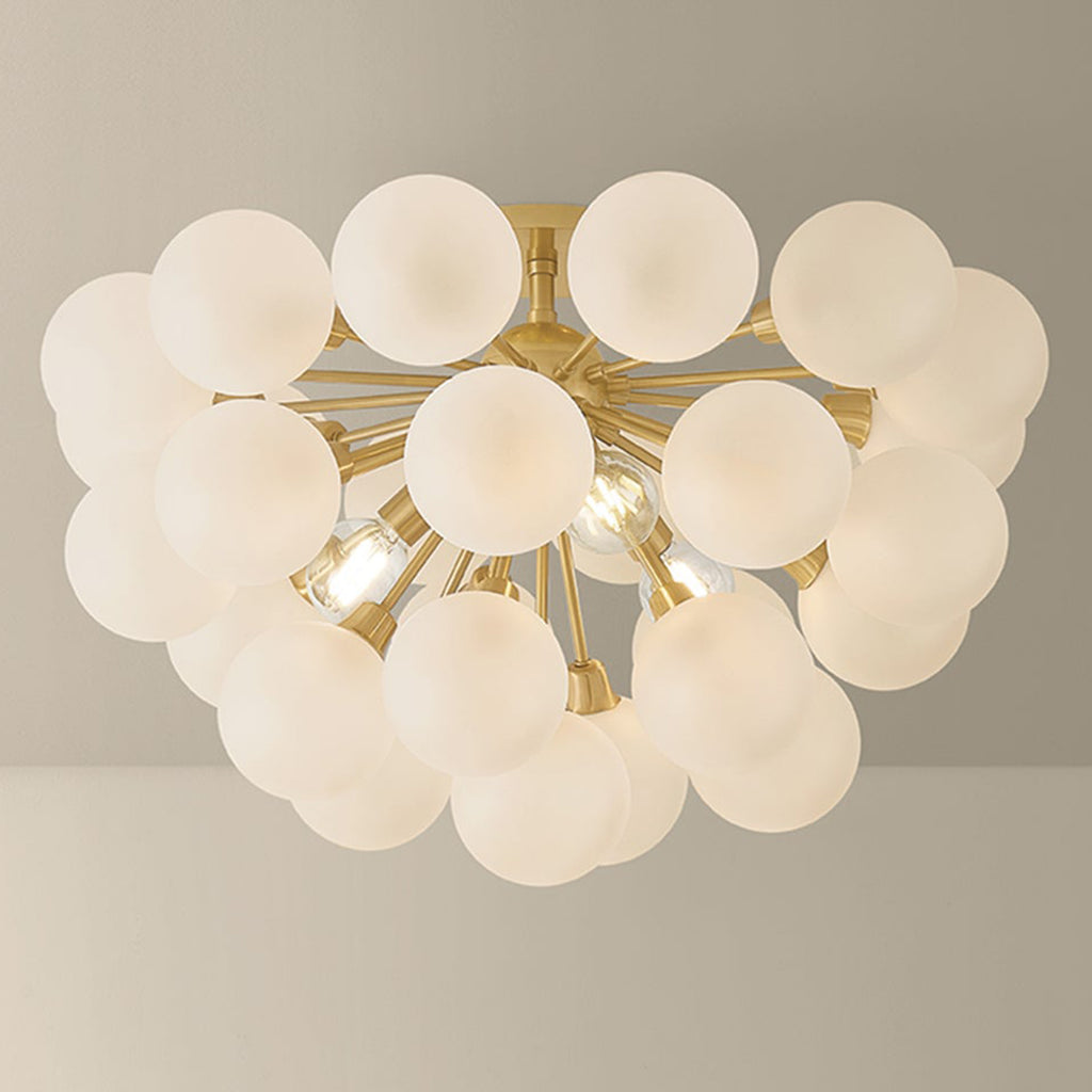 Mitzi Antoneta reimagines a classic Sputnik chandelier with a modern twist. Clear etched glass globes form a dense, bubbly silhouette of light and geometry. The clear etched glass shades soften the ambience, while the Aged Brass finish adds visual warmth. Available as a 3-light semi-flush or a 6-light chandelier, this celestial centerpiece is worth celebrating.