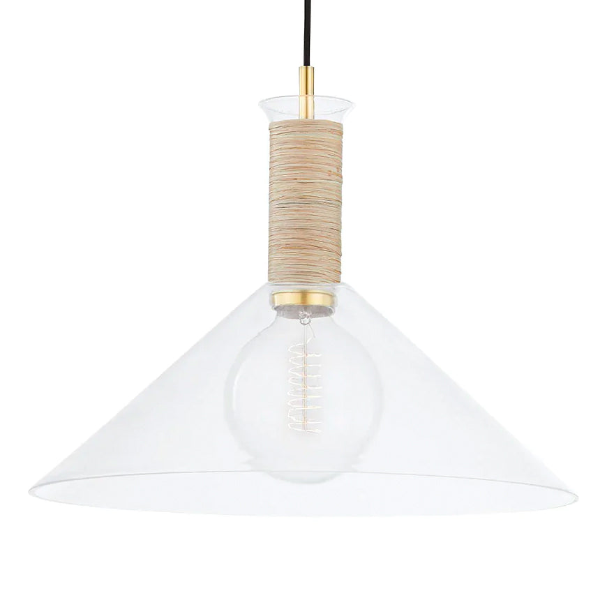 High-quality and exceedingly creative, Mitzi delivers a semi-nostalgic classic lighting collection with streamlined contemporary elements that instantly upgrade your space. Suspended from the ceiling, pendant lighting by Mitzi offers extra light expression exactly where you need it with a functional high-design feel. A cone-shaped shade in clean, clear glass lets brilliant, bright light shine through. The elongated neck is wrapped in raffia and the cord is made of black cloth, giving the piece little "kisses" of natural design. This pretty pendant looks casual yet feels sophisticated, making it a perfect choice for many interior styles.