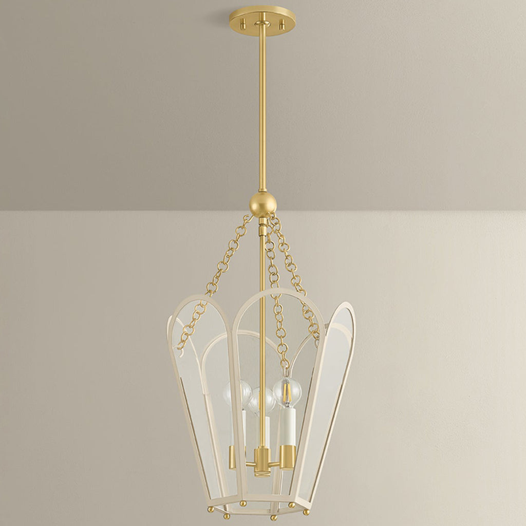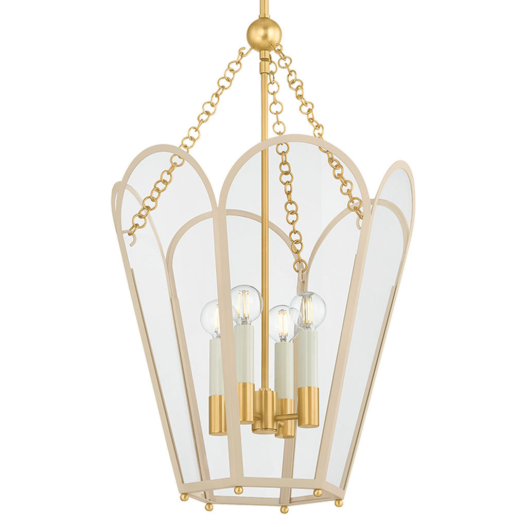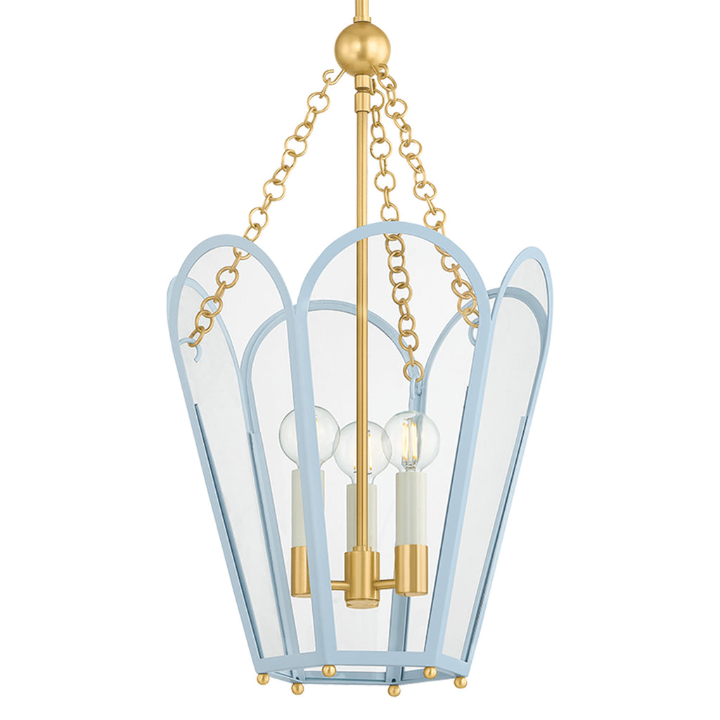 A classic lantern shape is reimagined with the spirit of modern romance. The hexagonal frame of Mitzi Clarisse features arched glass panels that reveal cream candles. With a mix of Aged Brass and either Soft Bisque or Arctic Ocean finishes, each lantern is a festive celebration of color. Available as a small 3-light or large 4-light design.