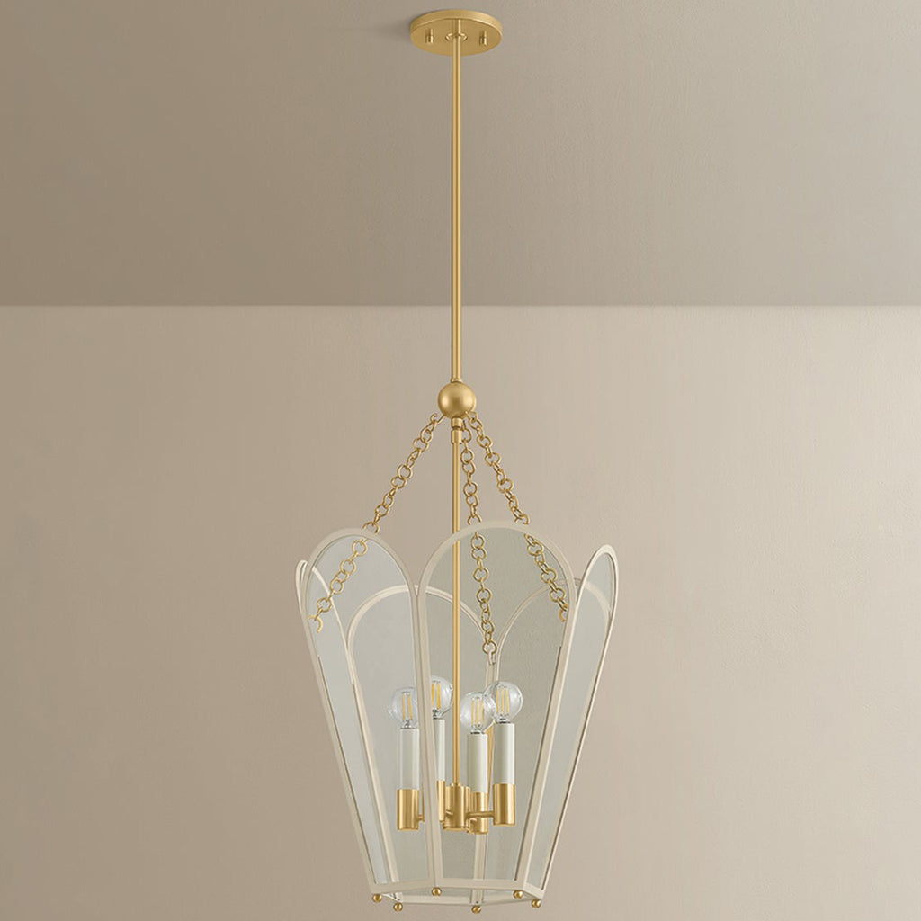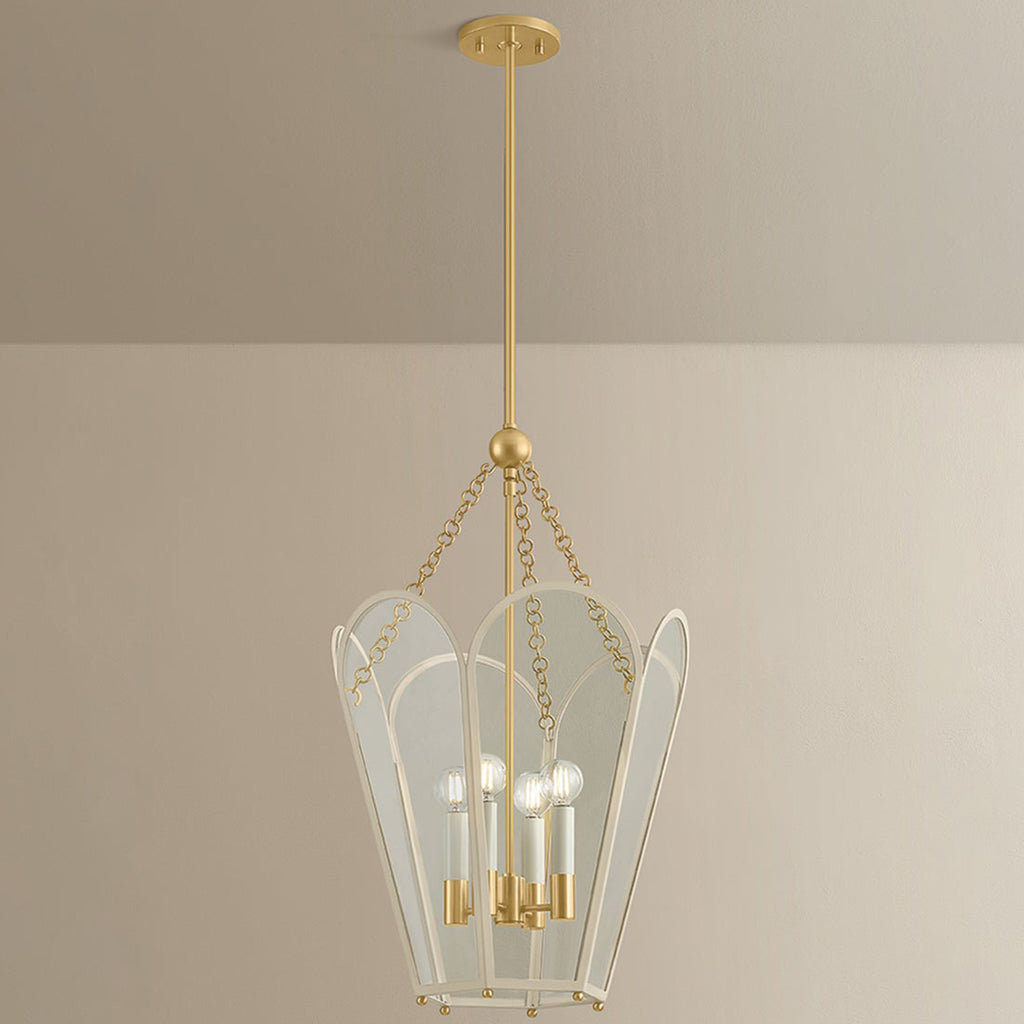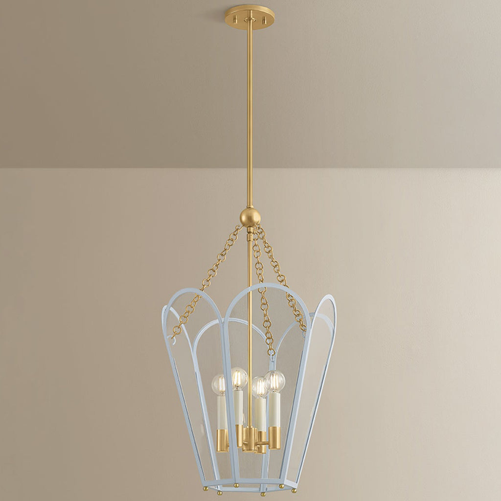 A classic lantern shape is reimagined with the spirit of modern romance. The hexagonal frame of Mitzi Clarisse features arched glass panels that reveal cream candles. With a mix of Aged Brass and either Soft Bisque or Arctic Ocean finishes, each lantern is a festive celebration of color. Available as a small 3-light or large 4-light design.