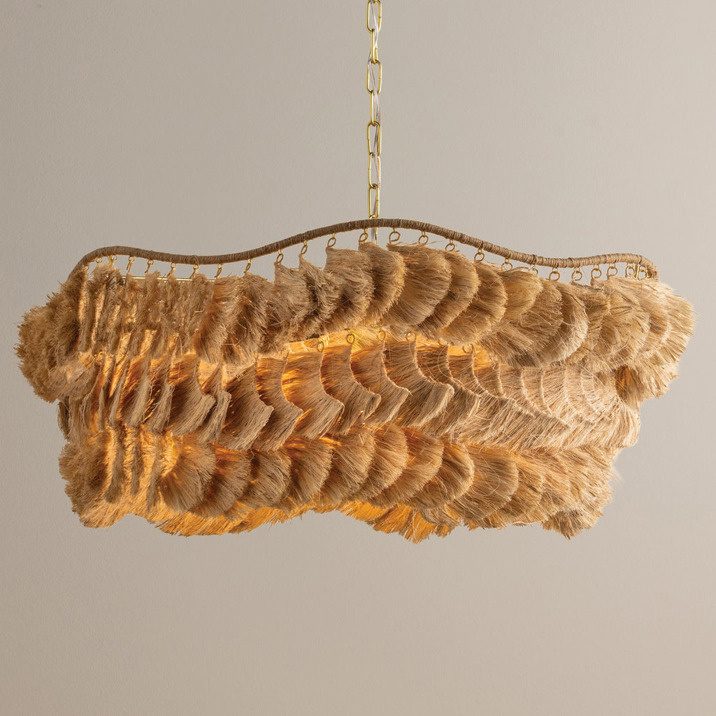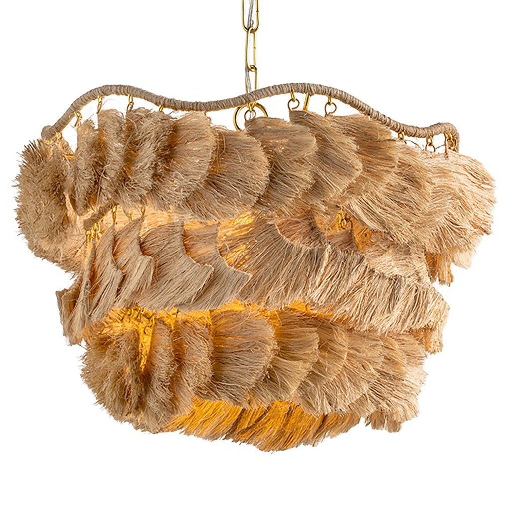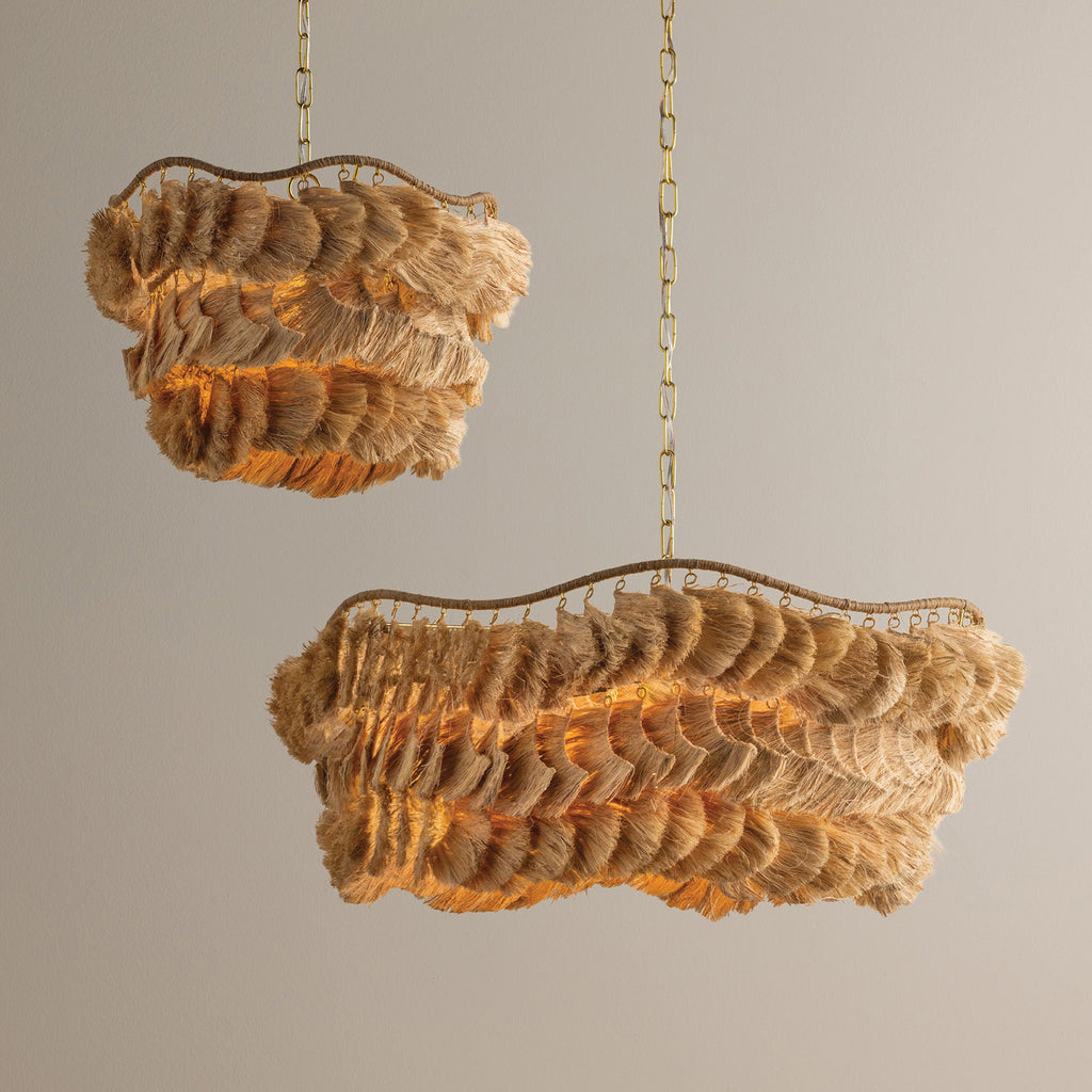 The Mitzi Daria chandelier makes a strong case for craftsmanship, finding ease in a complex composition. The undulating, wrapped frame is exposed at the top, celebrating the suspension of each separate piece of the shade. Soft, flowing strands of banana fiber textured, wave-like layers that face different directions to create the shaggy fixture. An Aged Brass finish adds a polished touch to this fiber art-inspired beauty. Daria is available in two sizes.