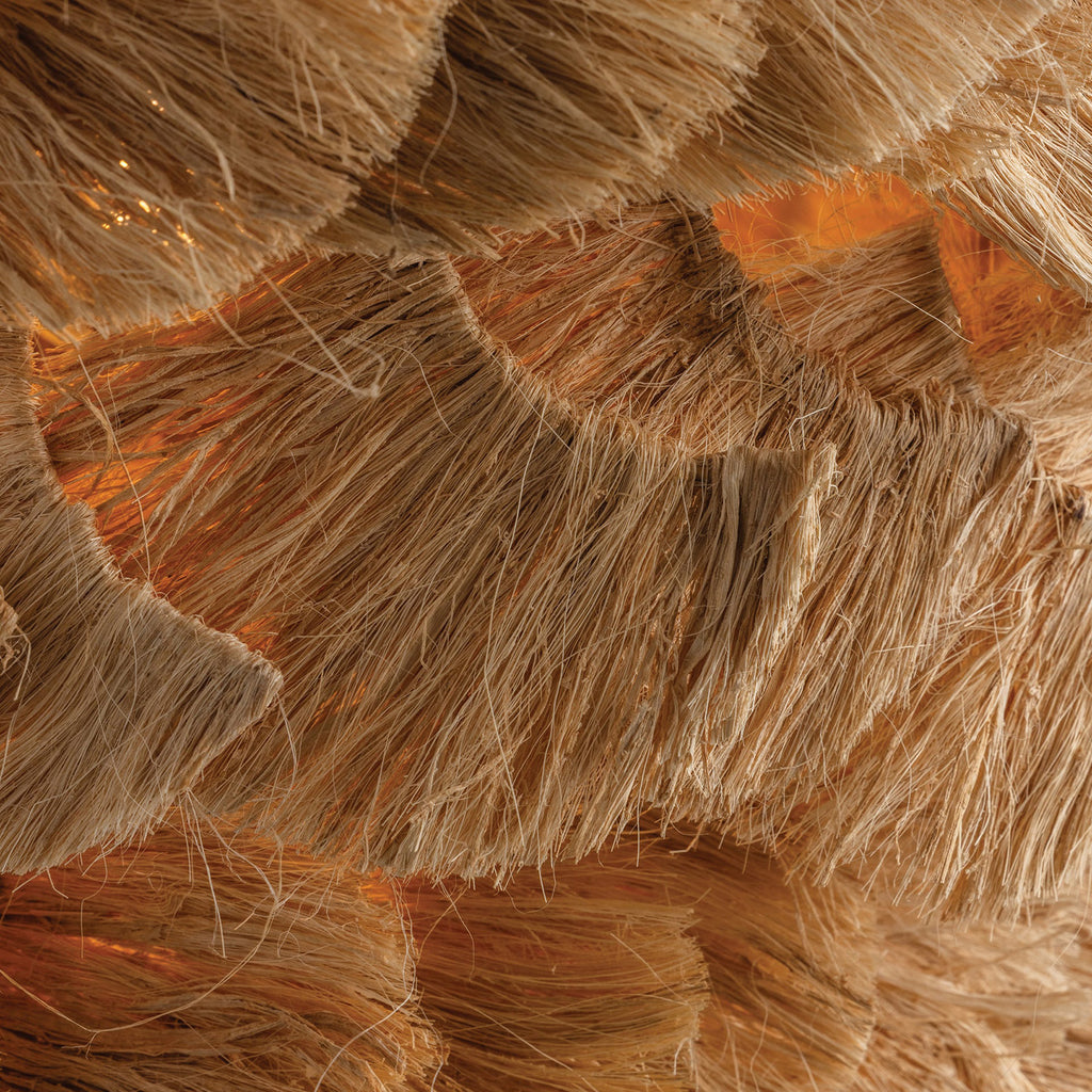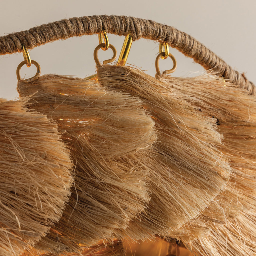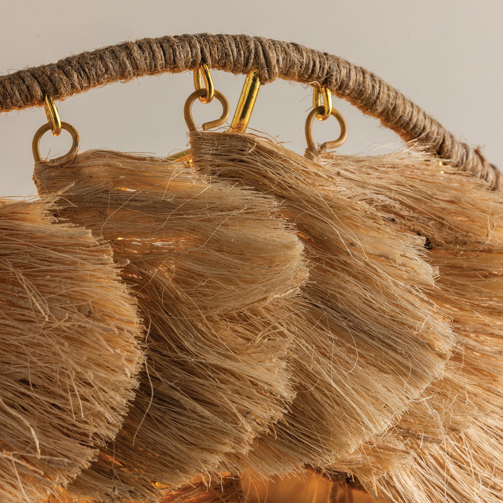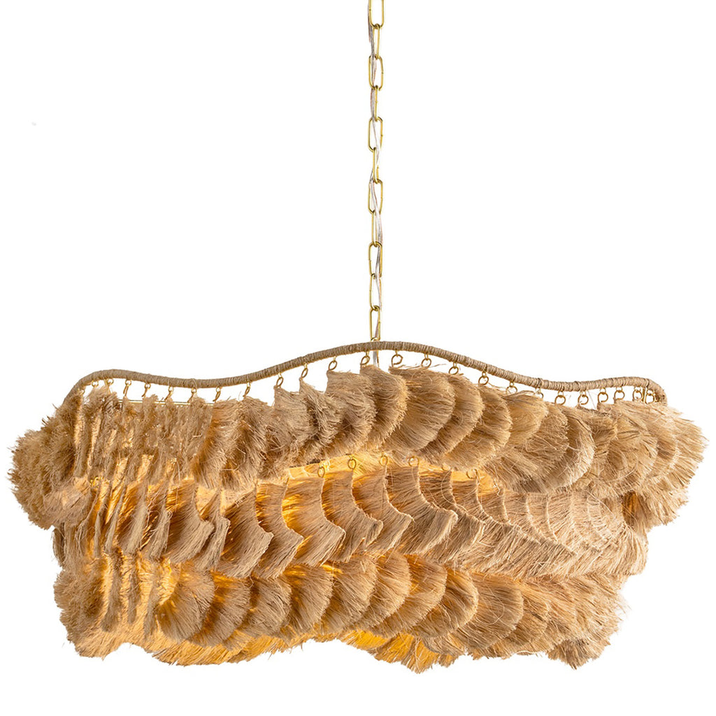 The Mitzi Daria chandelier makes a strong case for craftsmanship, finding ease in a complex composition. The undulating, wrapped frame is exposed at the top, celebrating the suspension of each separate piece of the shade. Soft, flowing strands of banana fiber textured, wave-like layers that face different directions to create the shaggy fixture. An Aged Brass finish adds a polished touch to this fiber art-inspired beauty. Daria is available in two sizes.