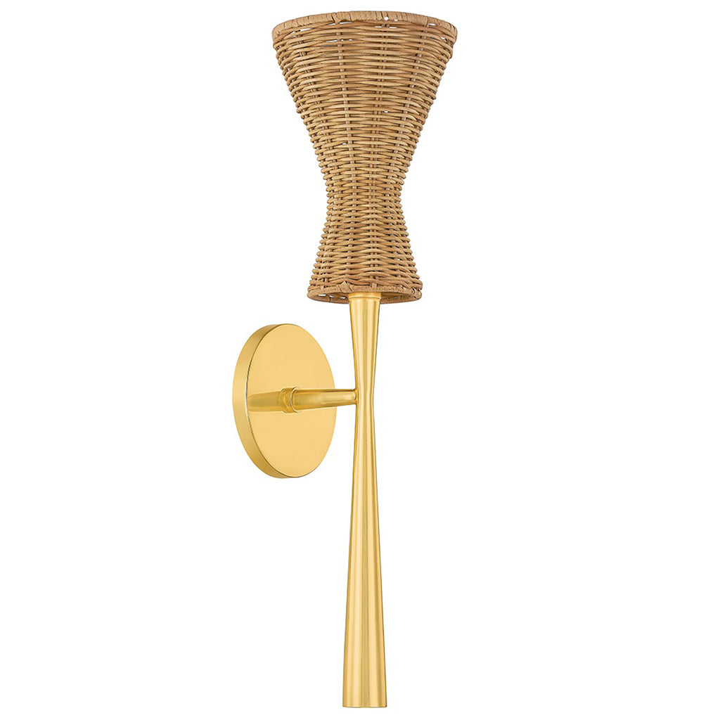 As sweet as honey, this charming sconce reimagines mid-century conical shapes in wicker. Both the shade and its Aged Brass stem taper inwards, resulting in subtly asymmetrical hourglass silhouettes. High design meets handmade in this well-considered accent light. *Due to the one-of-a-kind nature of the medium, exact colors and patterns may vary slightly from the image shown.