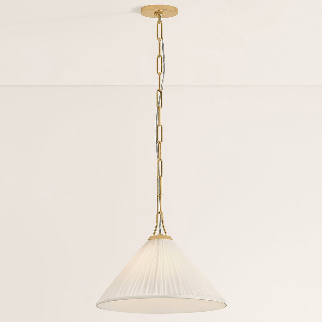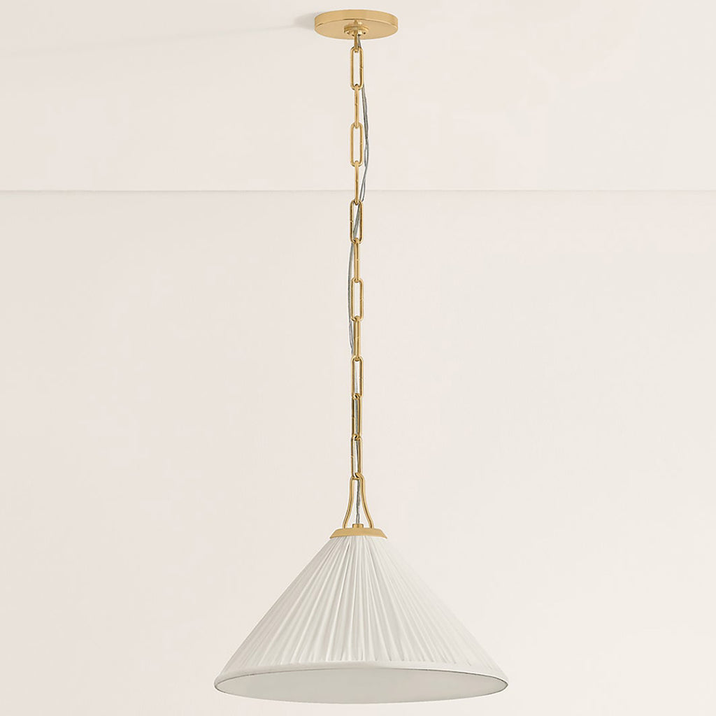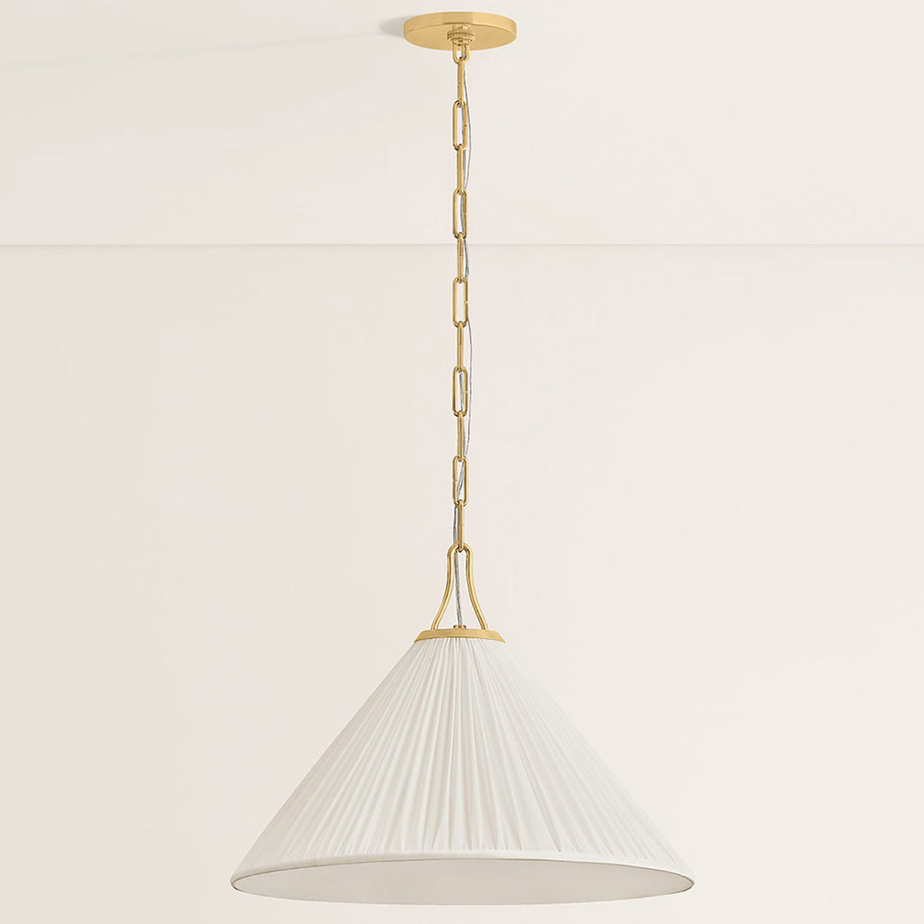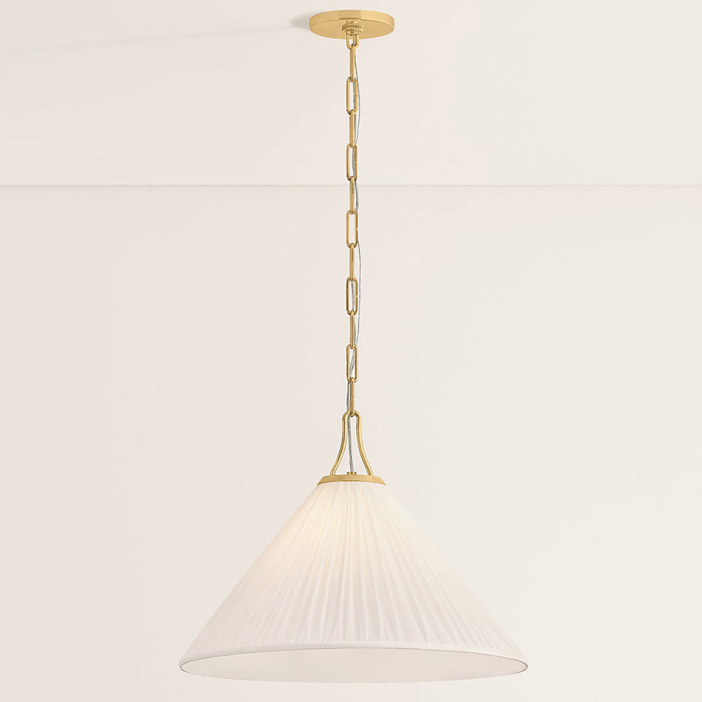 Elegant in its simplicity, the Mitzi Merida pendant pairs a pleated faux silk shade with crisp metalwork. A sleek racetrack loop extends from the top of the fixture, its elongated shape seeming to be drawn downward by the weight of the shade. Finished in Aged Brass, this special detail and classic chain add a clean modern touch to the design. Available in two sizes.