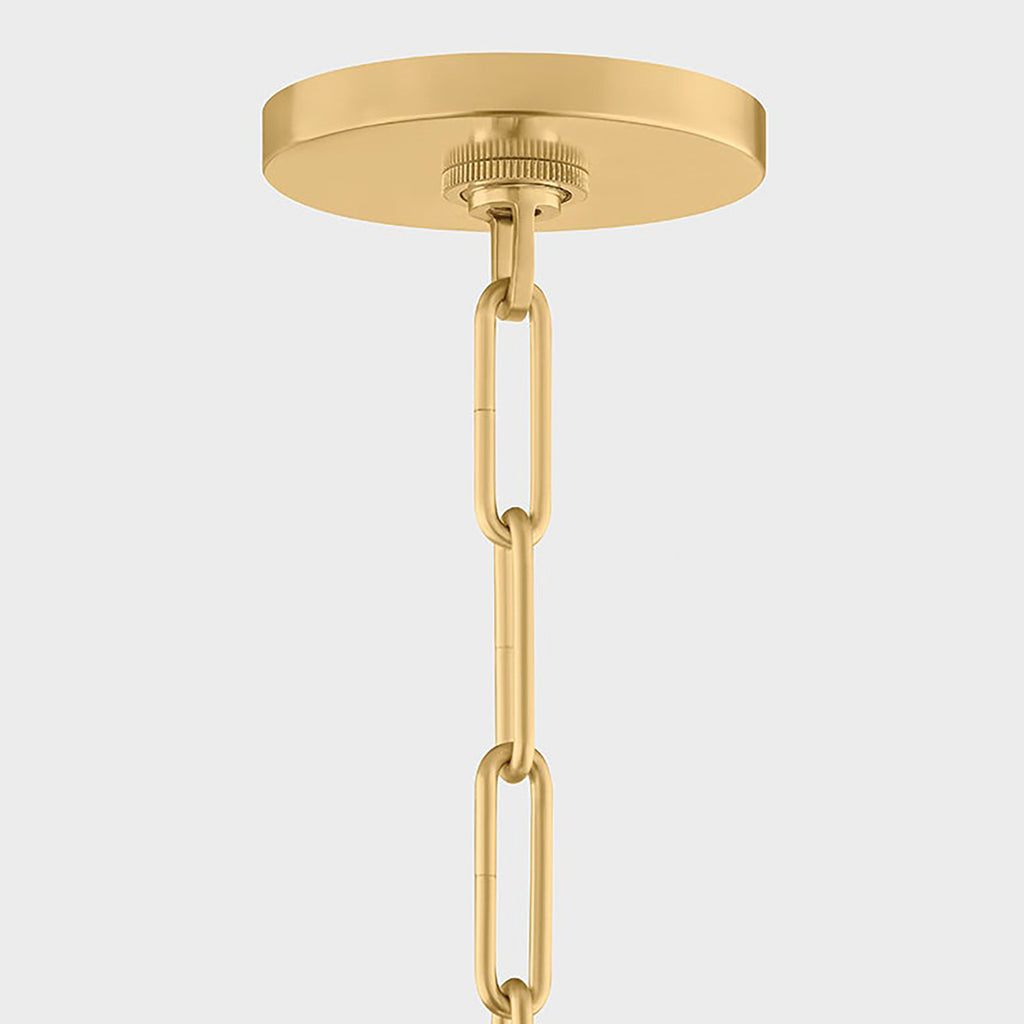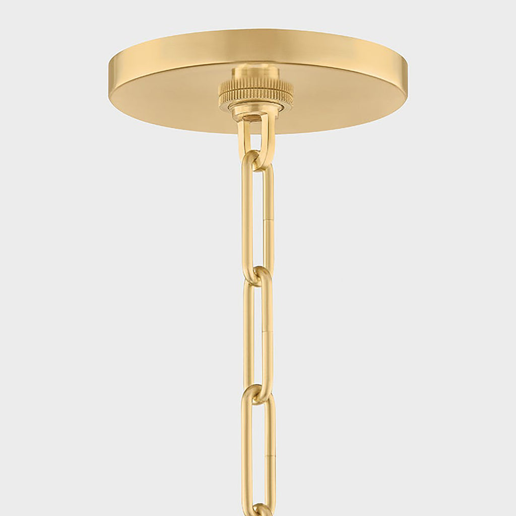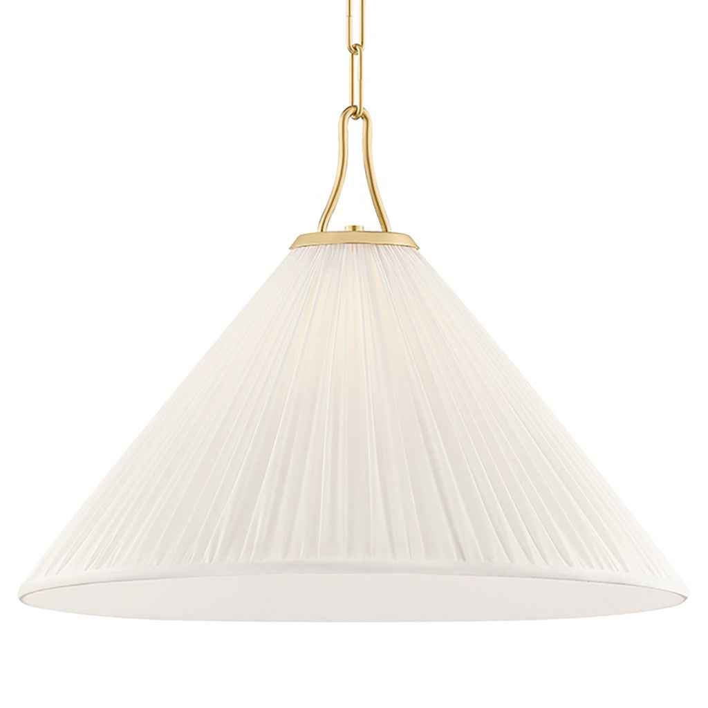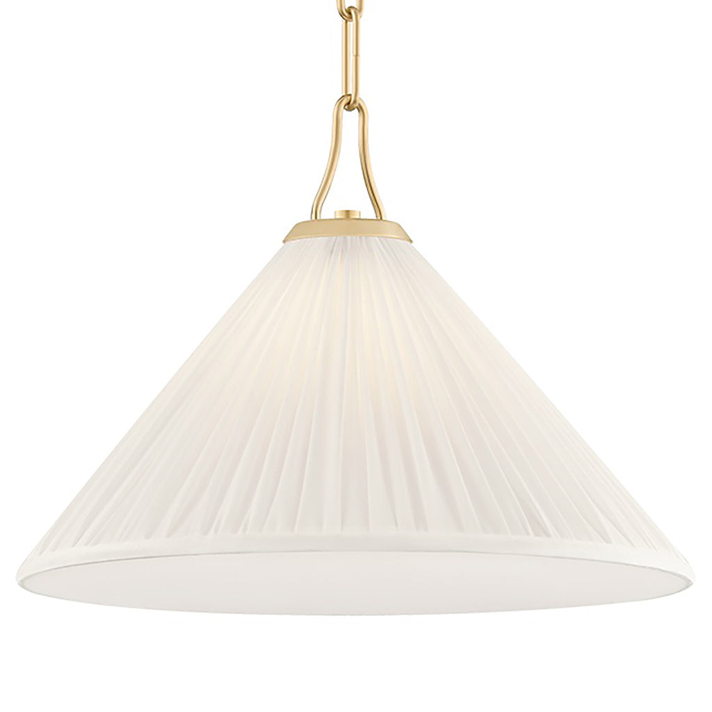 Elegant in its simplicity, the Mitzi Merida pendant pairs a pleated faux silk shade with crisp metalwork. A sleek racetrack loop extends from the top of the fixture, its elongated shape seeming to be drawn downward by the weight of the shade. Finished in Aged Brass, this special detail and classic chain add a clean modern touch to the design. Available in two sizes.