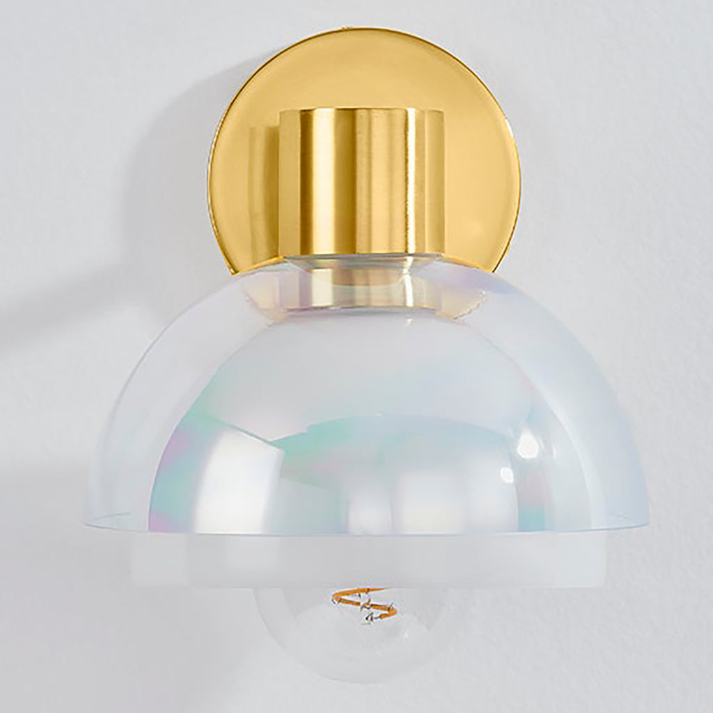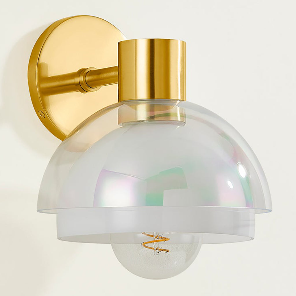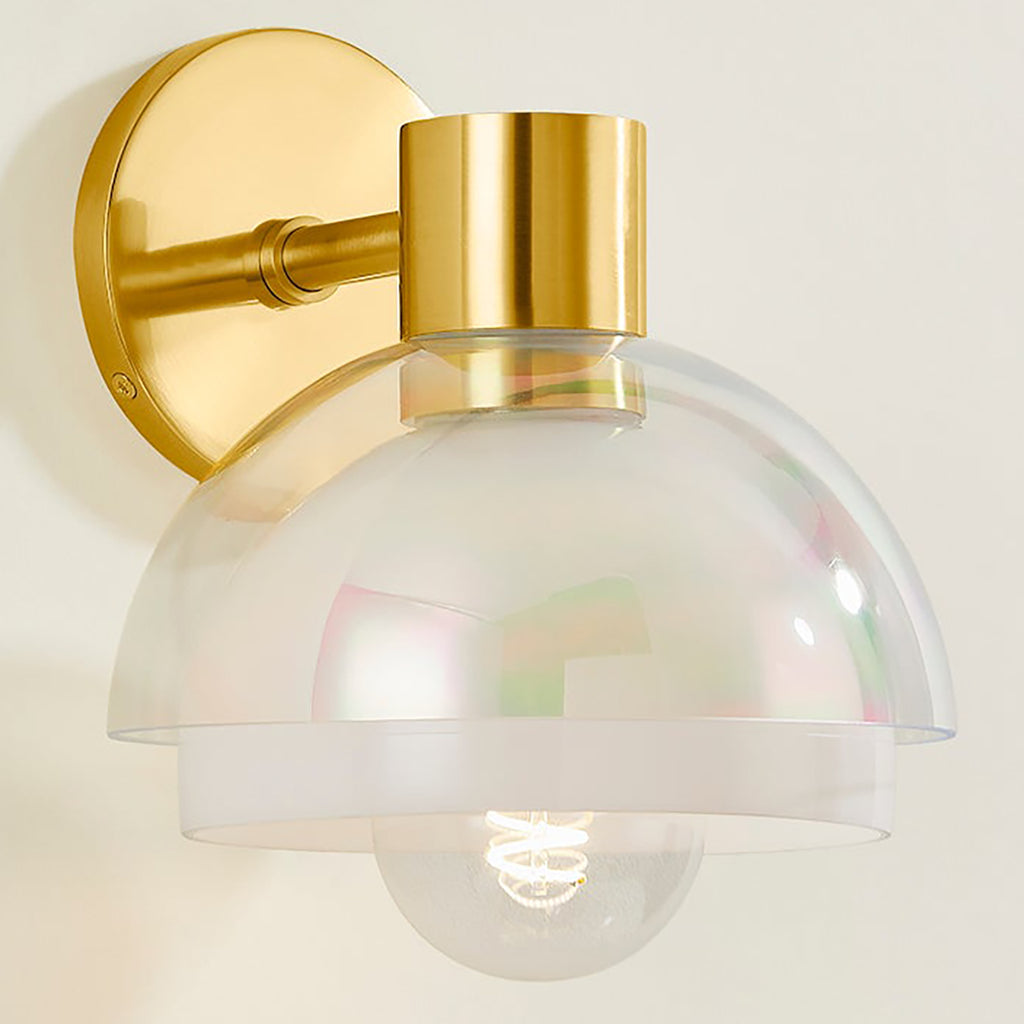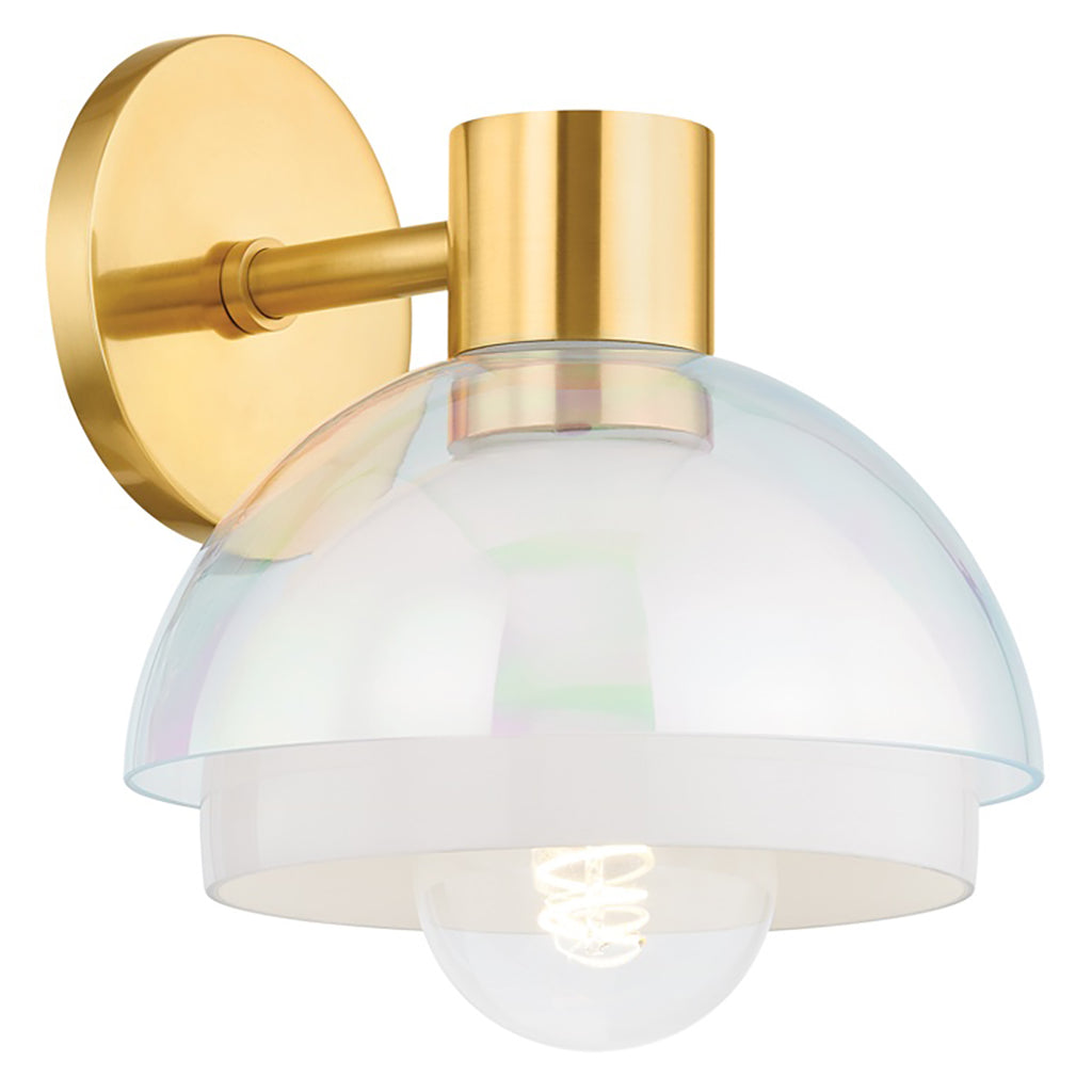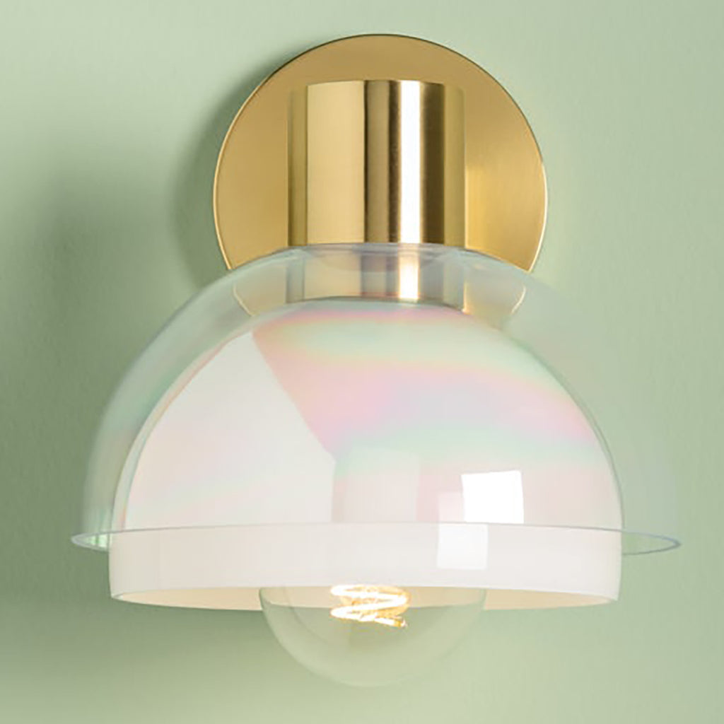 Playing with the layering of glass, Mitzi Modena Wall Sconce features two spherical shades that encircle the light source, creating a bubble-like halo. An opal interior shade is paired with an iridescent exterior shade, creating an ethereal interplay of light and shapes. The Aged Brass metalwork adds to the luxurious feel of the fixture as it reflects the light.