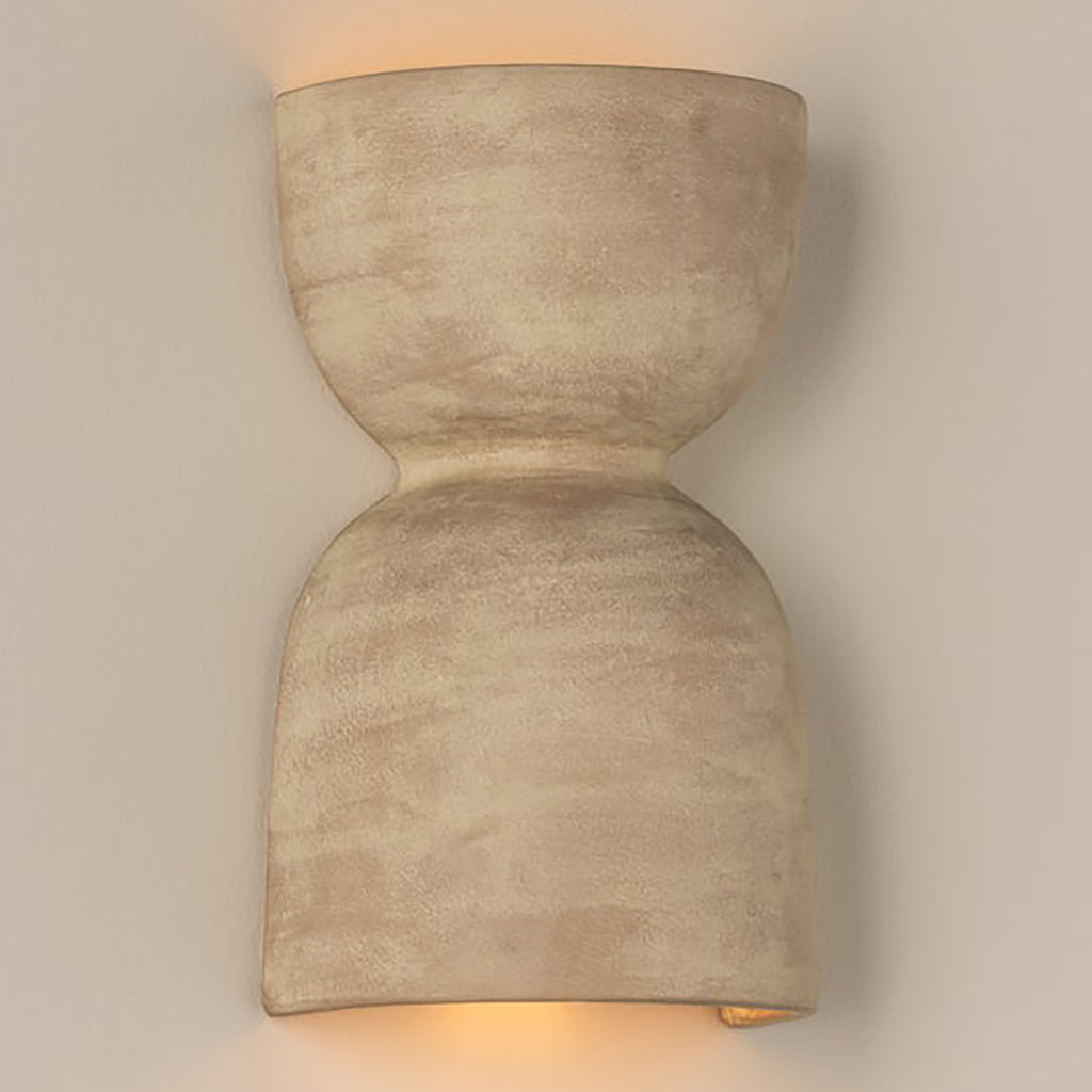 Inspired by the look of stone, the Mitzi Natalia sconce has an organic, flexuous form with an all-over earthy ceramic Windy Dune finish. The soft, weathered texture brings the expressive shape to life, lending a found-object look. Equipped with two lights and Aged Brass inner hardware, this petite sconce serves as a unique wall washer that can be used in a variety of spaces.