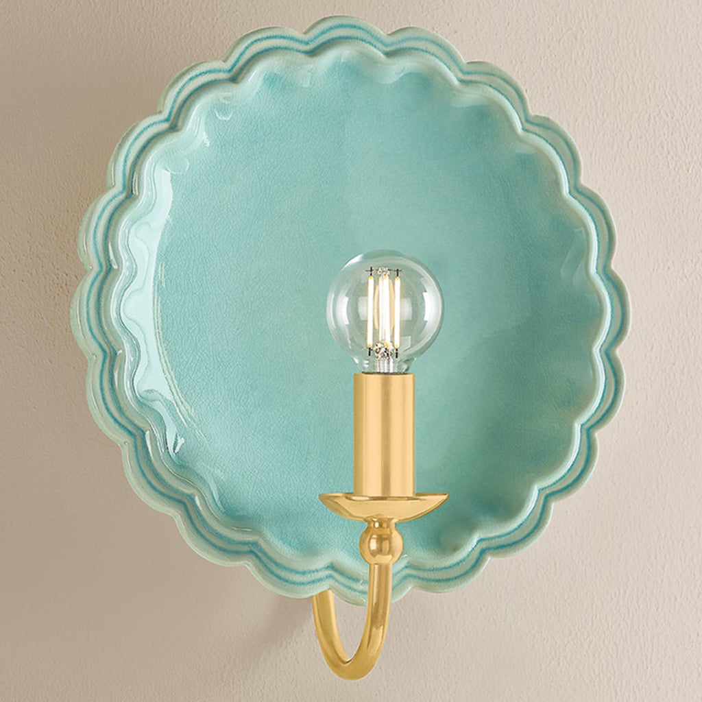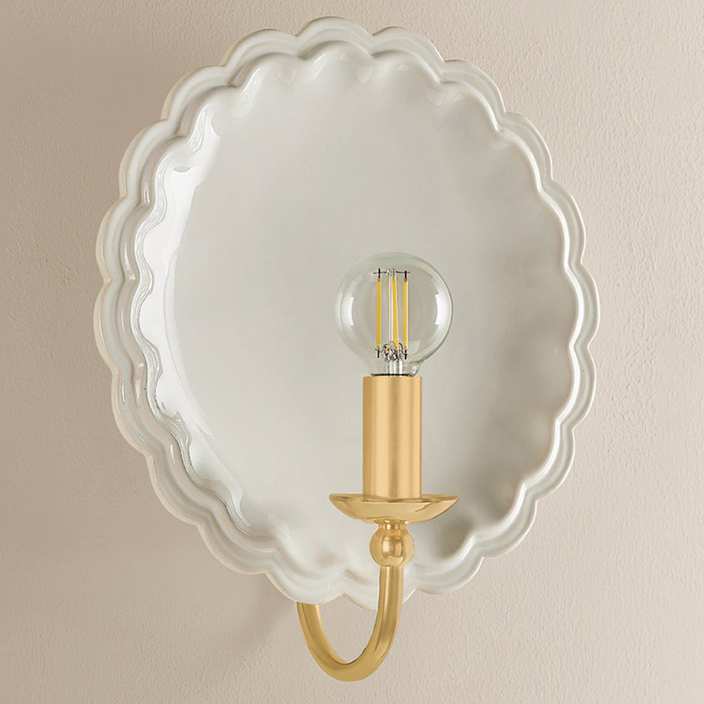 The delicately scalloped Mitzi Paulette sconce embodies the spirit of new Romanticism, transforming functional lighting into artful expression. A hand-sculpted ceramic backplate creates an expressive vignette in either Gossamer Ivory, Indigo Wash, or a Moss Crackle glaze. An Aged Brass gooseneck arm introduces a heritage detail that completes this transitional fixture.