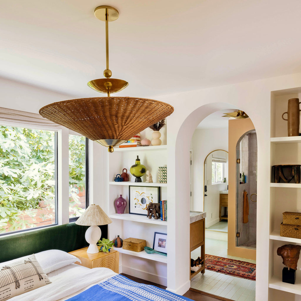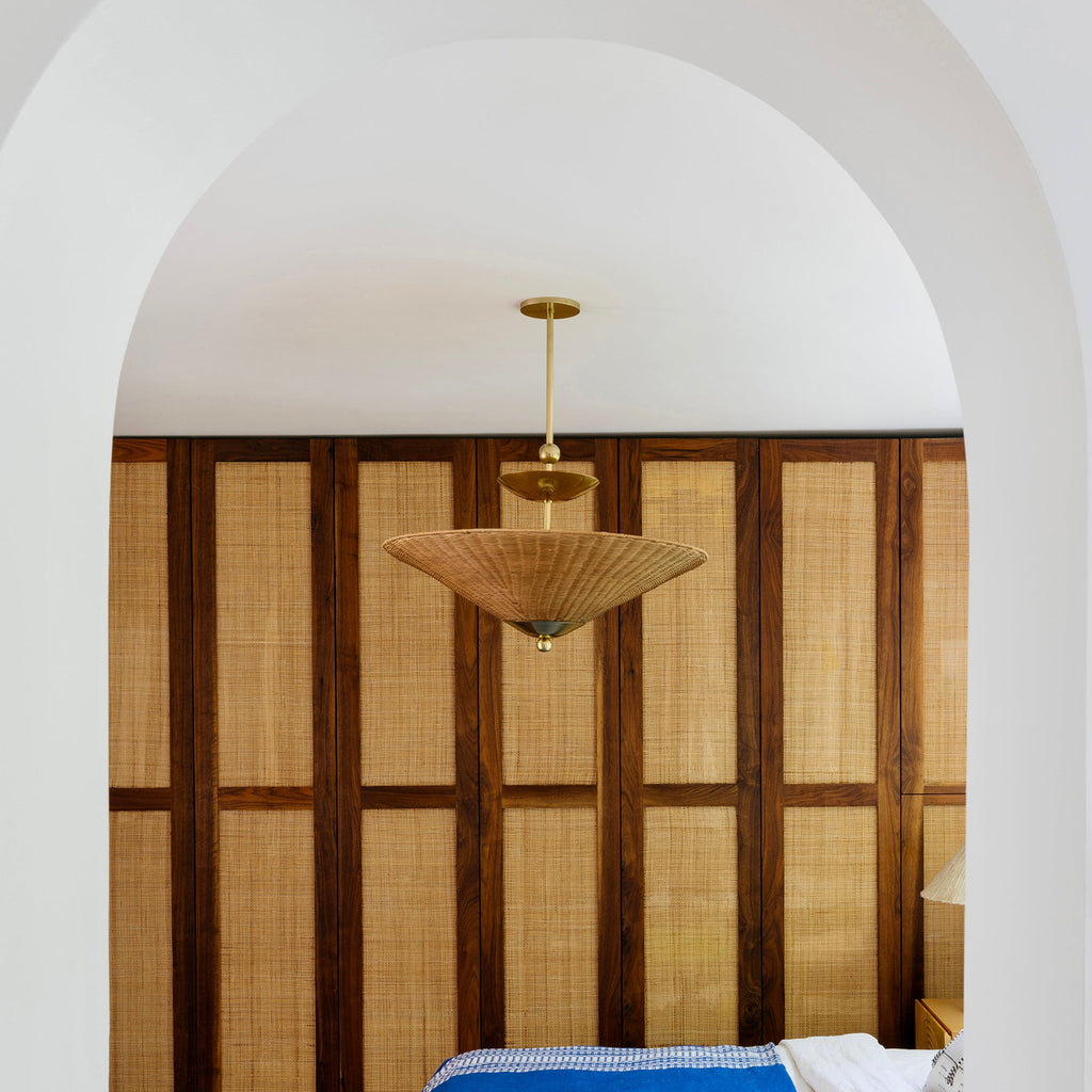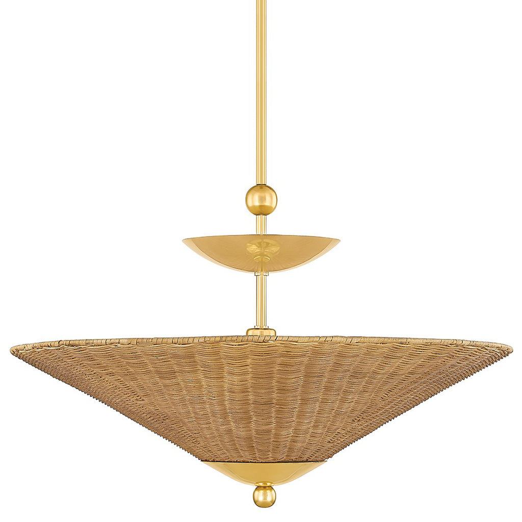 Playing with shapes, texture, and light, Mitzi Perilla creates modern geometries from a surprising mixture of materials. The elongated frame supports stacked forms that culminate in a textural wicker rattan shade. Decorative sphere details add an artisanal touch to the design. Mitzi Perilla is available as a pendant, table lamp, or wall sconce in two finishes, Aged Brass and Old Bronze. Part of our Dabito x Mitzi Tastemakers collection. *Due to the one-of-a-kind nature of the medium, exact colors and patterns may vary slightly from the image shown.