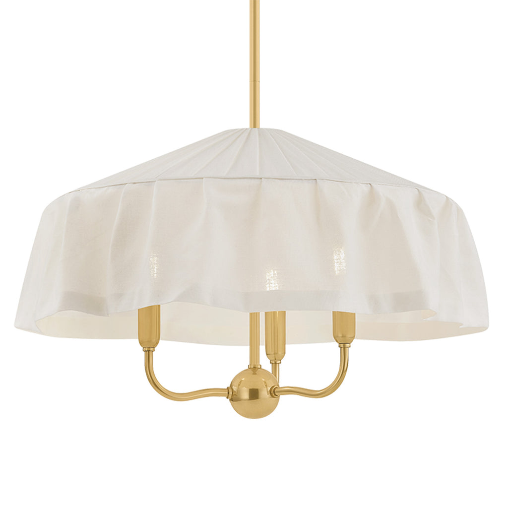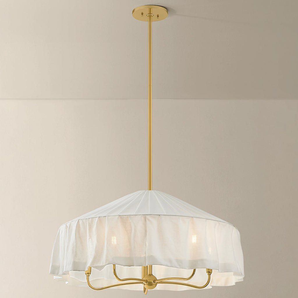 Paying homage to the modernist designs of Adolf Loos, the soft materiality of Mitzi Shivonne creates a poetic statement piece. This ethereal chandelier features an ivory linen shade that loosely drapes like a skirt as it envelops a 3- or 5-light candle cluster. An Aged Brass finish on the frame adds to the vintage character, while a fabric-covered cord maintains a sense of cohesion with the shade.