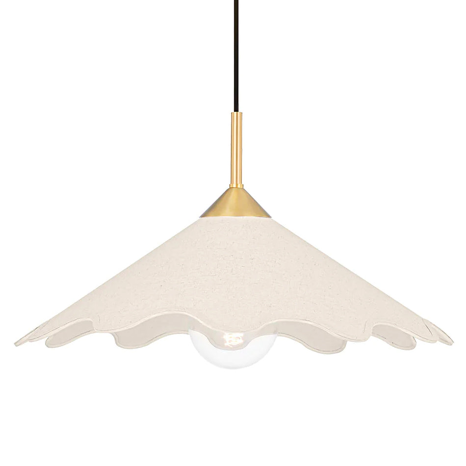 High-quality and exceedingly creative, Mitzi delivers a semi-nostalgic classic lighting collection with streamlined contemporary elements that instantly upgrade your space. Sang is jewelry-inspired lighting at its finest. Crisp, clean and effortlessly chic, Sodsai elevates the traditional pendant light. Pretty scalloped detailing on the natural linen shade soften the design. Just a hint of the clear glass bulb is visible from beneath the shade, sending a bright, clear light below while filling the shade above with a warm glow. The white shade, aged brass finish and black fabric-covered cord perfectly complement each other—and any color scheme.