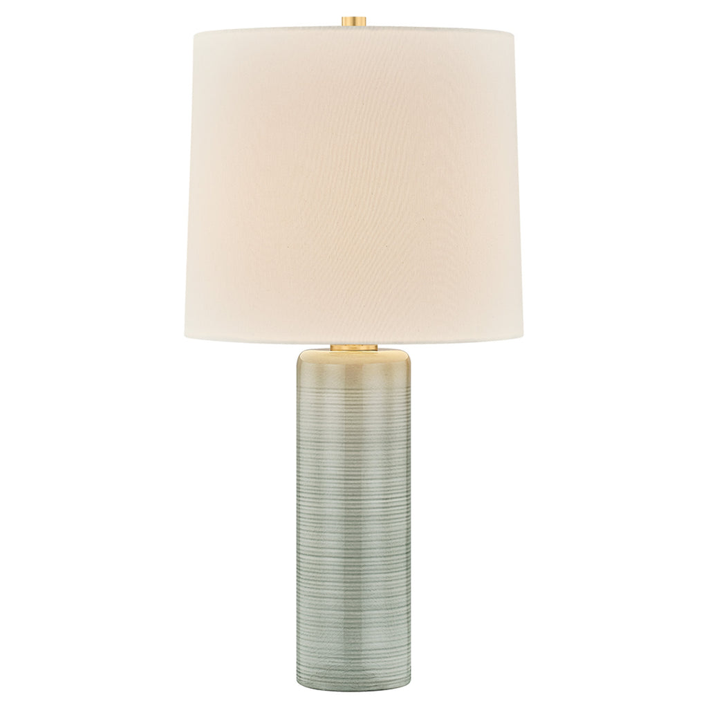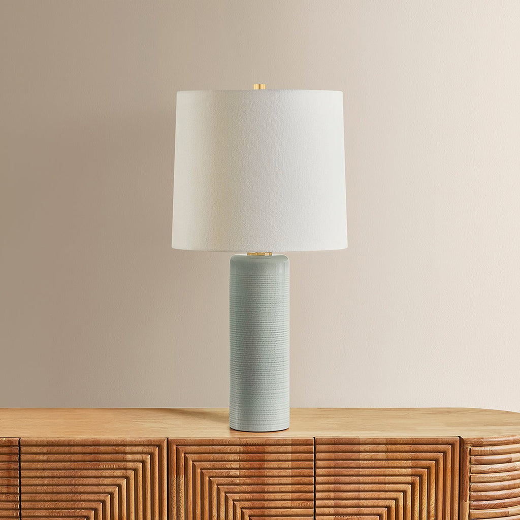 The Mitzi Tuva table lamp takes a minimal form and elevates it with a distinctive ceramic finish. The tall, cylindrical base is coated in a pale blue Silver Lake glaze, which darkens within the fine horizontal ribs to emphasize the discreet pattern. Topped with a generously sized off-white linen drum shade, Tuva’s sculptural form brings quiet character to any tabletop or bedside.
