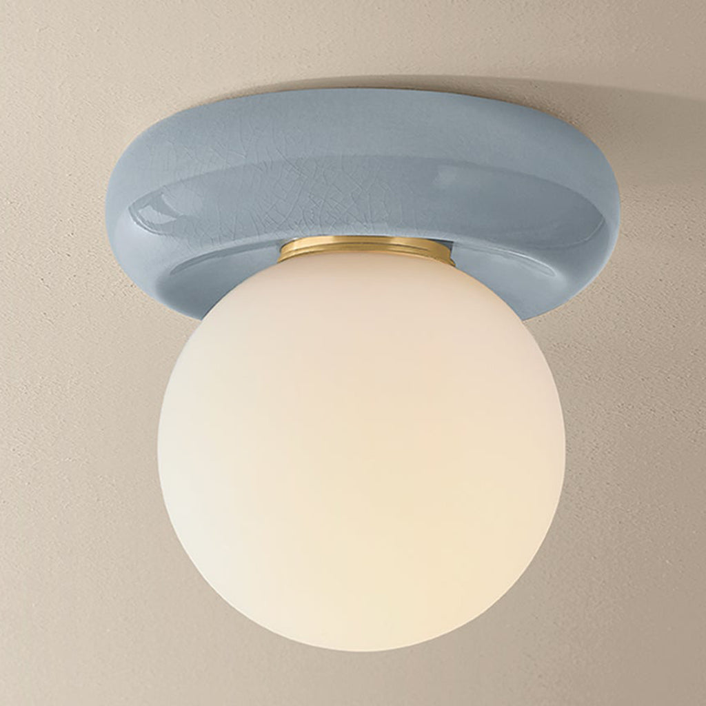 The soft, pillowy form of the Mitzi Tyra flush mount turns illumination into contemporary sculpture. A spherical matte opal glass shade is paired with a sculptural ceramic cap, glazed in either Ivory Crackle or Frost Crackle. With a compact 8.75-inch diameter, this petite fixture is flexible for many environments. Mount it on the ceiling or wall to serve as either a flush mount or sconce.