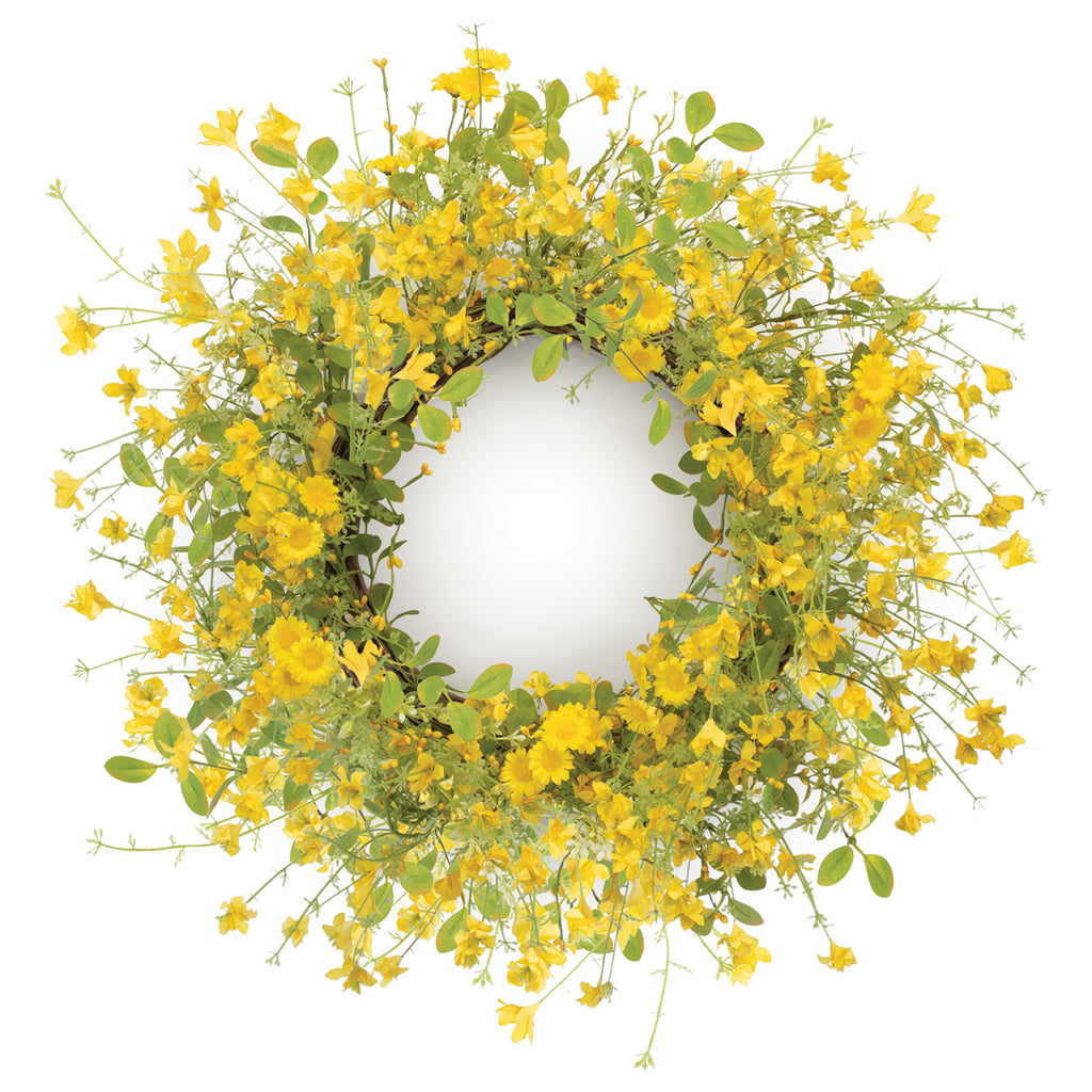 Let the sun shine in with the Mixed Daisy Floral Wreath. Add a touch of nature to your home with this beautiful wreath, featuring natural green and bright yellow floral tones, quality grapevine twig base, and foliage accents. Crafted from quality plastic and polyester fabric, this wreath is sure to bring a warm and cheerful atmosphere wherever you place it! Adorn your front door or entryway to welcome guests with this beautiful floral wreath today!