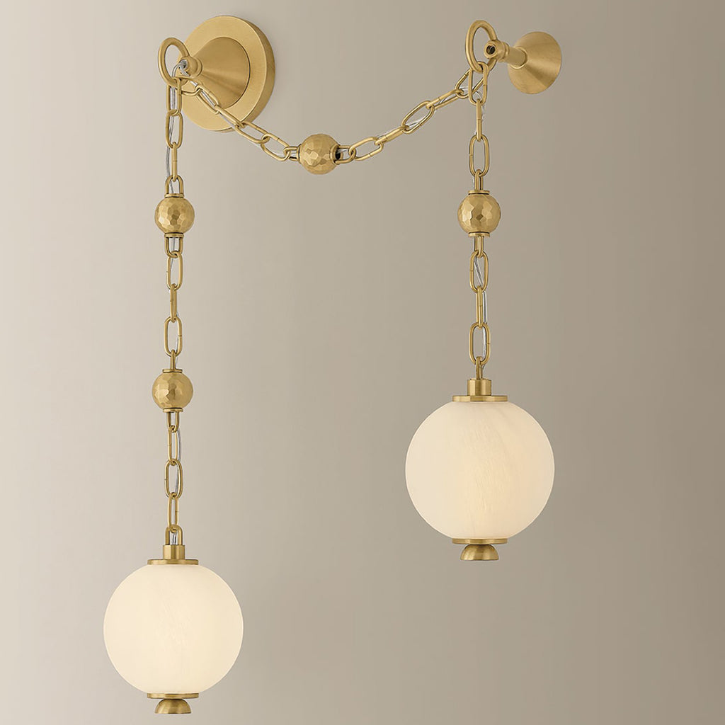 Corbett Lighting Corda draws inspiration from the elegance of heirloom jewelry—where light becomes adornment, and structure tells a story. Hand-blown matte cloud glass spheres are suspended from gleaming Vintage Brass chains, accented by delicate ball chain details, evoking the richness of layered pearl and charm necklaces. Available as a 2-light sconce, a 6-light linear, and a dramatic 12-light chandelier, Corda’s layered suspension system allows for customizable hanging methods, introducing an unexpected sense of movement and personalization. It brings a sense of intimacy and ornament to a space, casting a warm, glamorous glow that is both delicate and intentional.