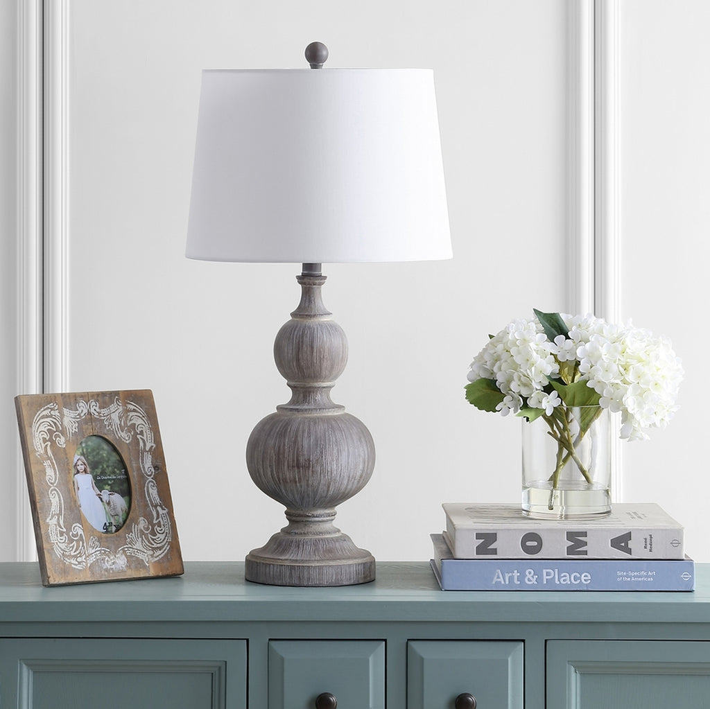 Inspired by nature's beauty, this graceful Montura Table Lamp instantly refreshes any living room. Designed with durable faux wood, its gentle curves feature a weathered, elegant finish that pairs perfectly with its matching finial and complimentary cotton shade.
