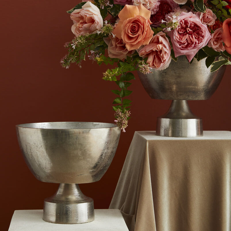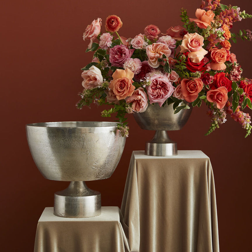 Bring sleek sophistication & an old world sensibility to any table setting with the silver aluminum Moreland Compote. This cool metal bowl makes a striking visual statement for any wedding & event design. The compote foot unscrews for compact shipping & transport, while the interior can accommodate a floral dish.