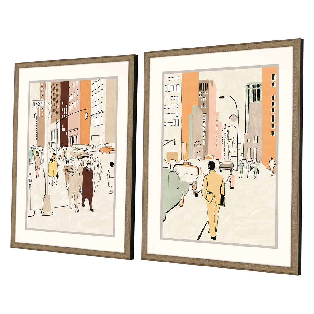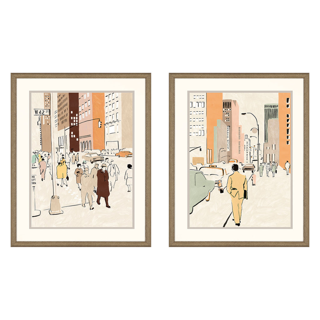 Urban scenes display the hustle and bustle of city life. Images are matted in white and framed in an antique gold wood with embossed weave pattern. Sold as set of two.