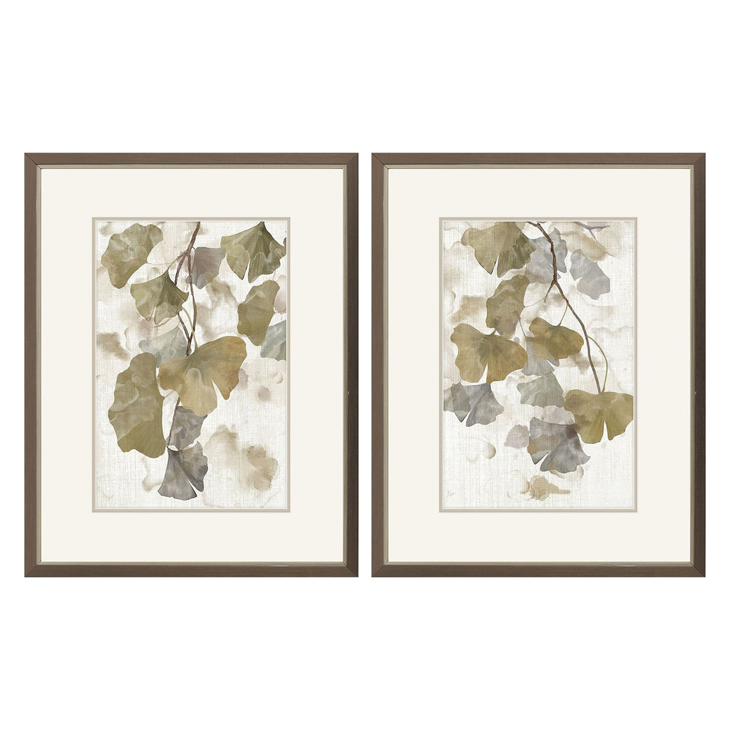 Cascading gingko leaves are matted in white. Framed in a brushed pewter finish moulding with a silver lip.
