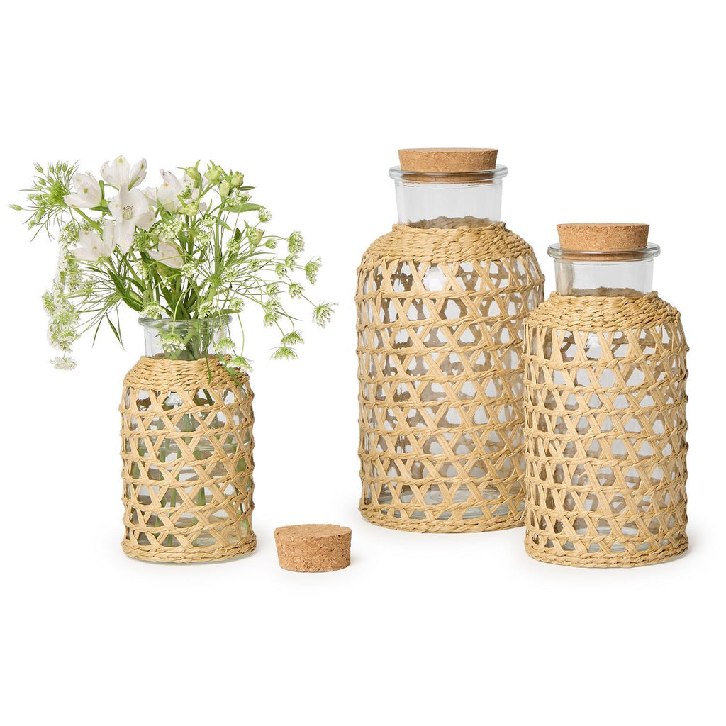 Transform your space with our set of 3 Natural Lattice Wrapped Jars with Cork Stopper. Handcrafted with intricate lattice detailing, these jars exude elegance and charm. Made from high-quality glass, paper, and cork, they add a touch of nature to any room. The cork stoppers provide functionality, keeping your contents fresh and secure. Use them to store spices in the kitchen, display succulents in the living room, or hold cotton balls in the bathroom. Versatile and stylish, these jars are a must-have for every home.