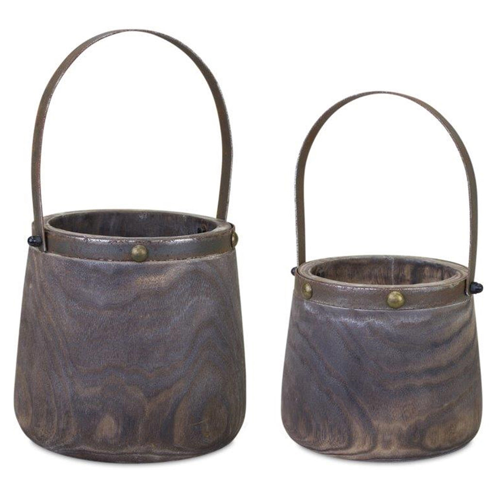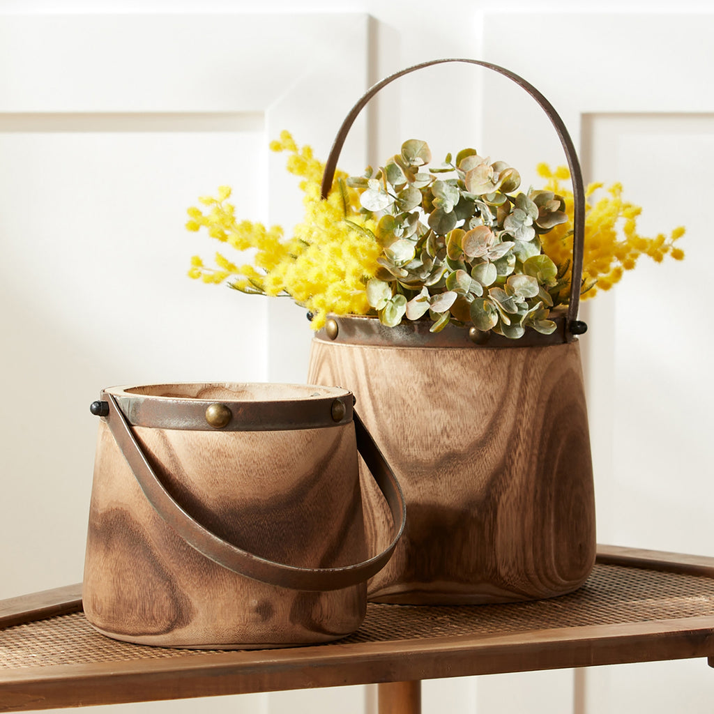 Natural Wooden Pail Planter with Metal Handle Accent Set of 2