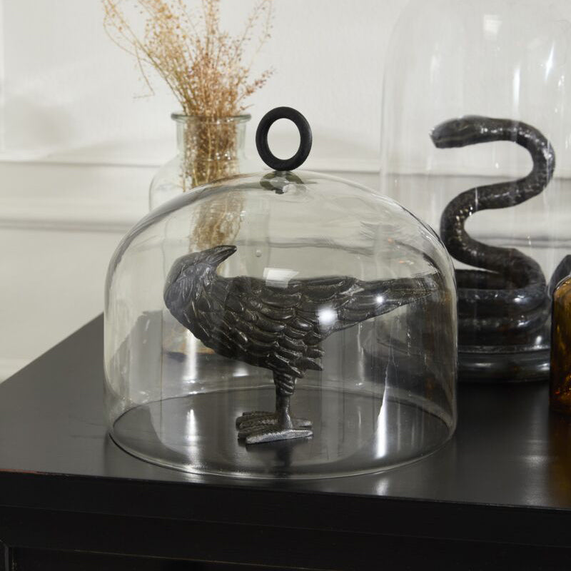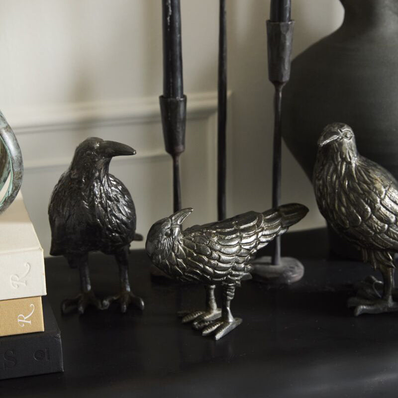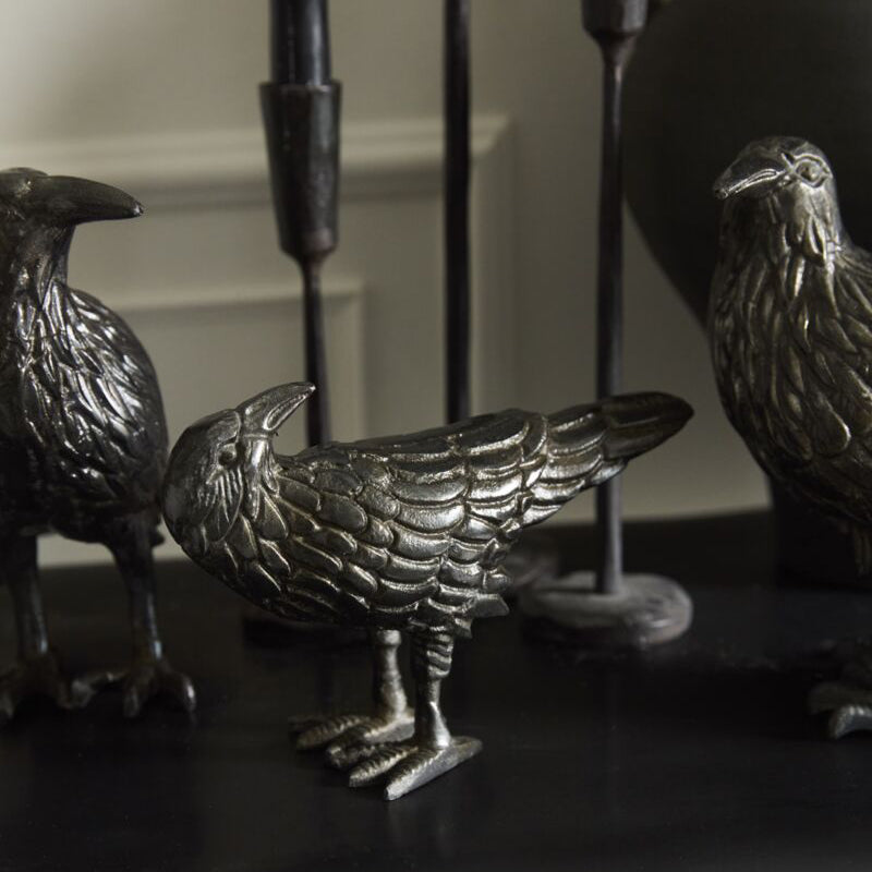 Add a spine-tingling touch to your Halloween decor with the Nevermore Figurine, featuring cast aluminum metal with a dark gunmetal finish. Perfect for creating an eerie atmosphere, this raven can be styled on any surface or displayed under the Hazy Cloche for an elevated, haunted look.