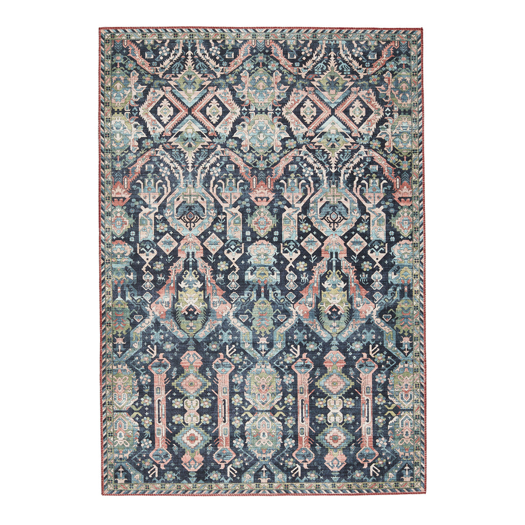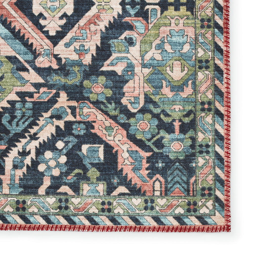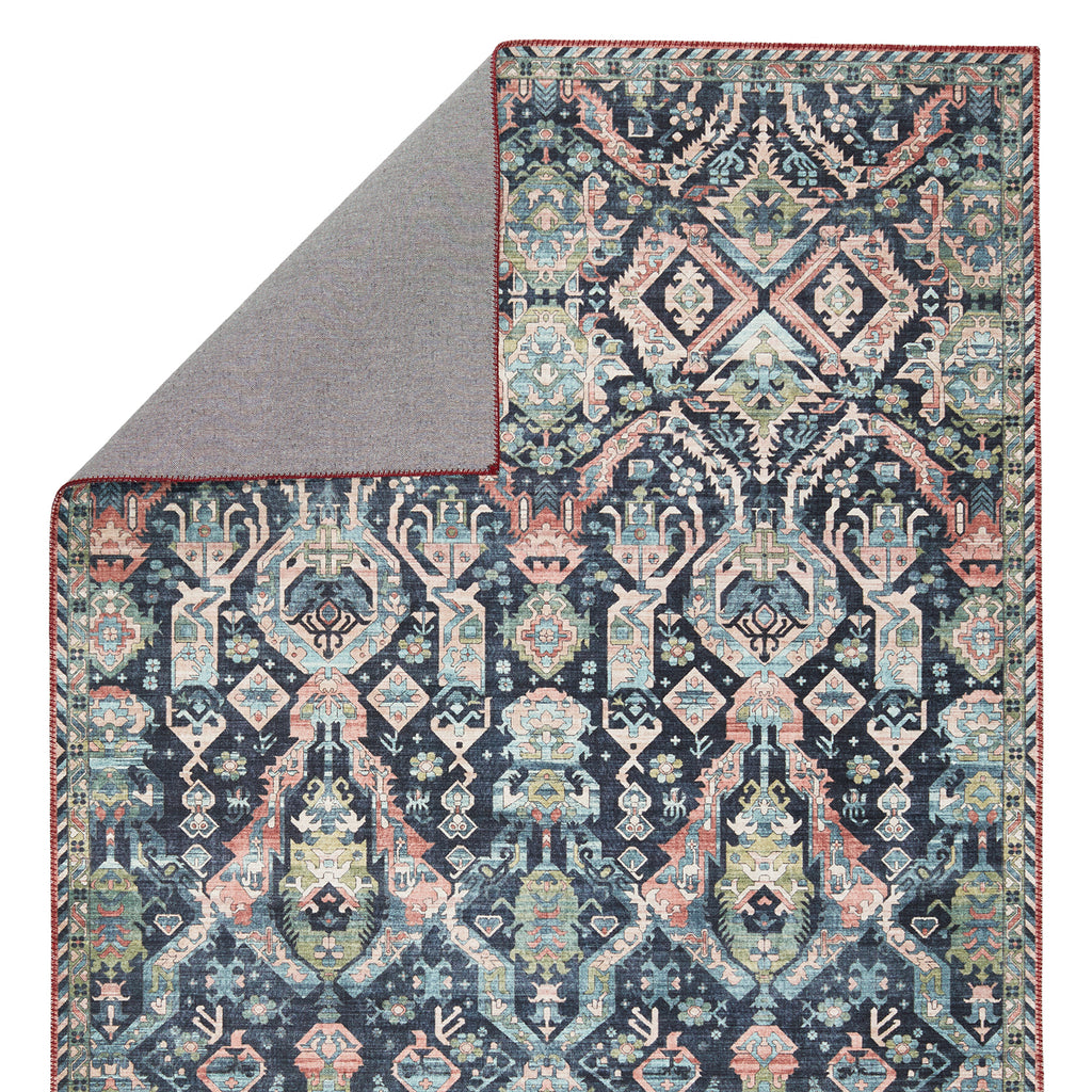 The Jaipur Living Keyara collection by Nikki Chu melds the timelessness of vintage designs with fresh, global style. The Teleza rug showcases a beutifully saturated tribal motif with a detailed border and moody colorway of deep blue, green, and clay tones. This low-profile rug is made of soft polyester and features vibrant and artistically distressed digitally printed design.