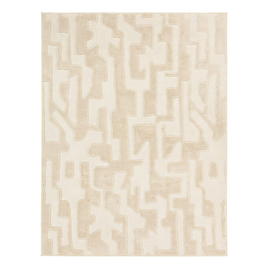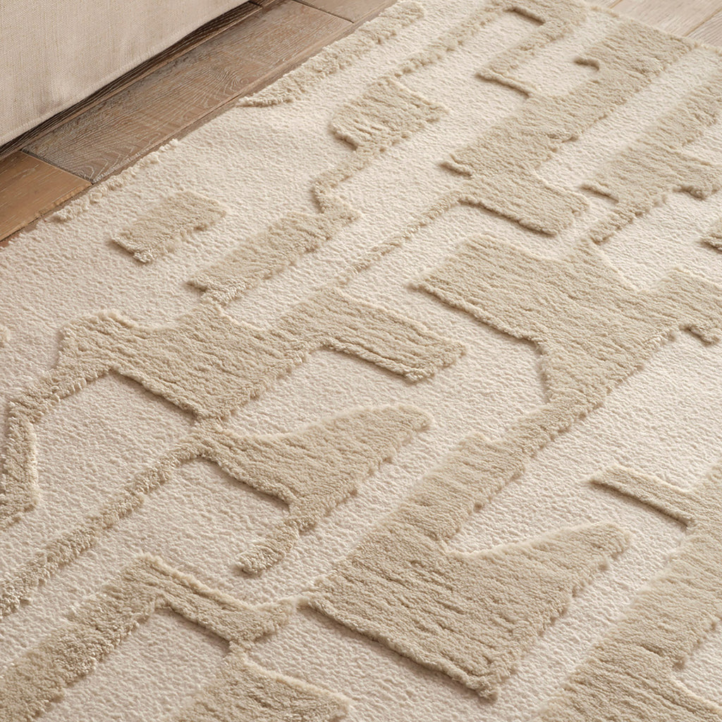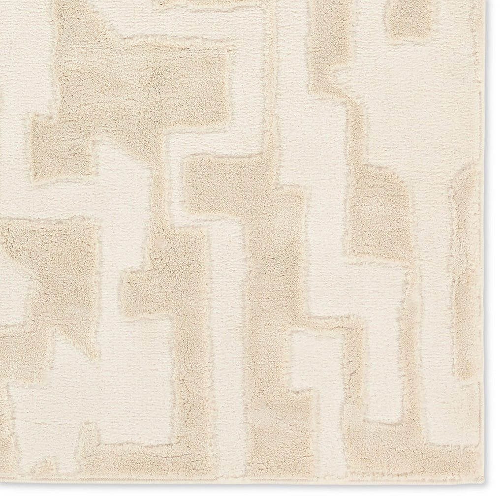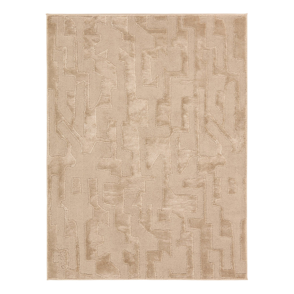 Modern geometrics and a lustrous sheen define the Calix Collection by Nikki Chu. The soft, plush pile features high and low areas for added texture that delights underfoot. The Demir design showcases a tan/taupe Brutal geometric pattern, exuding modern elegance. Crafted from a durable blend with natural stain resistance, it effortlessly combines style and practicality.