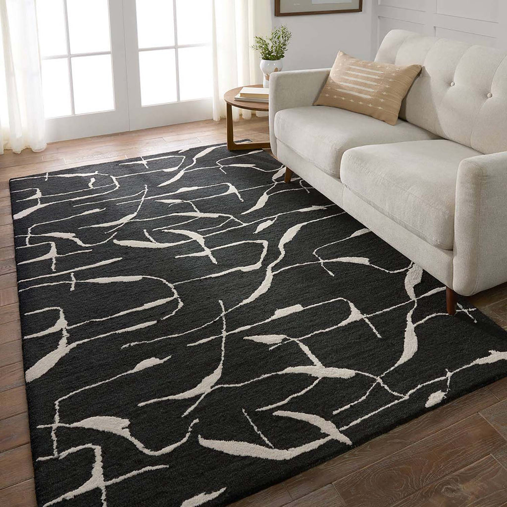 The hand-tufted Jaipur Living Mallino collection designed by Nikki Chu infuses homes with contemporary appeal and stylishly contrasting motifs. Handmade of durable wool, this rug boasts a plush, inviting feel underfoot. The abstract design in tones of black and cream invoke an effortlessly chic style. This accent piece perfects high and low traffic of the homes, such as living rooms, bedrooms, halls, and formal dining areas.
