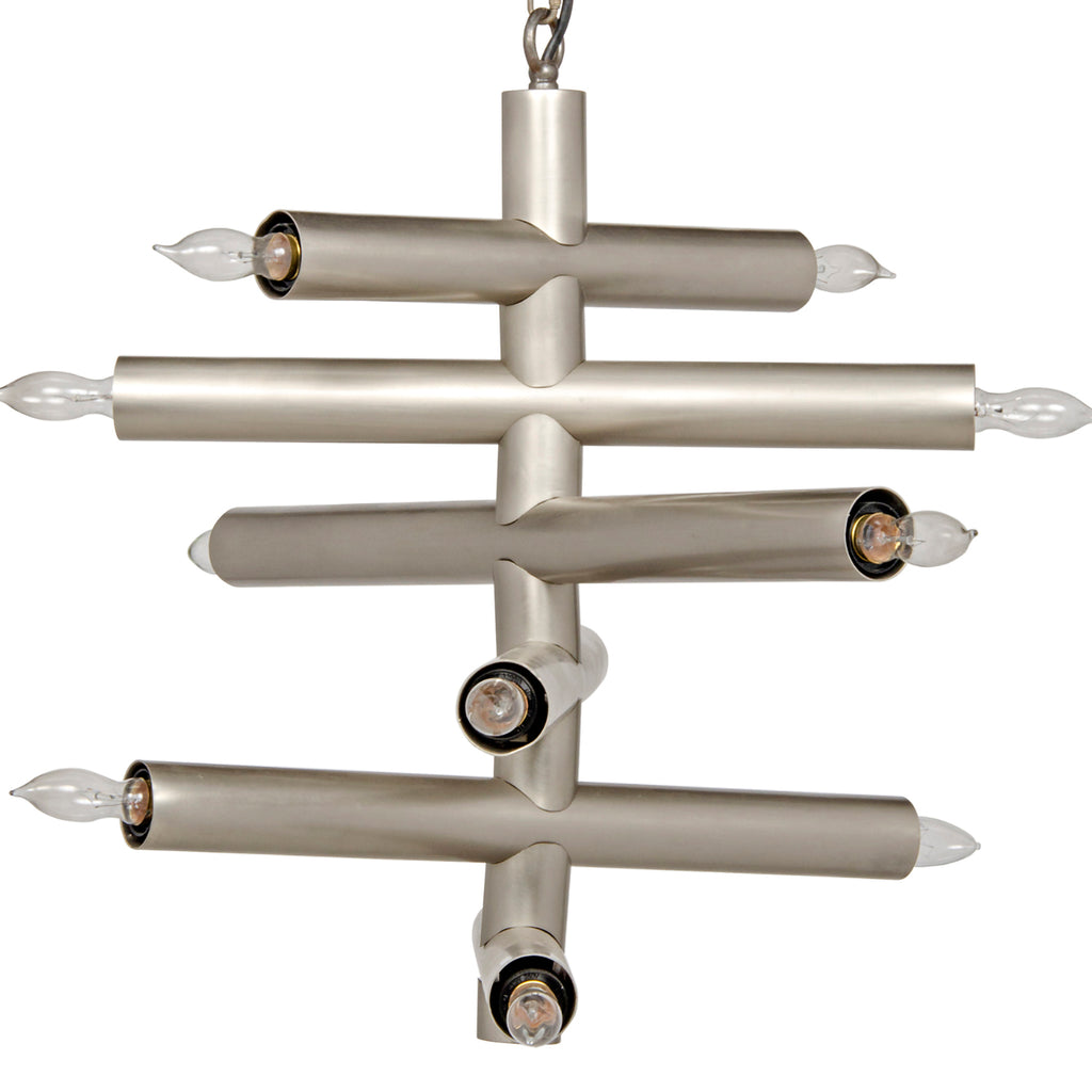 This pared down chandelier is the essence of simplicity. Handcrafted of metal with a antiqued silver, it is sleek, sophisticated, and very contemporary.